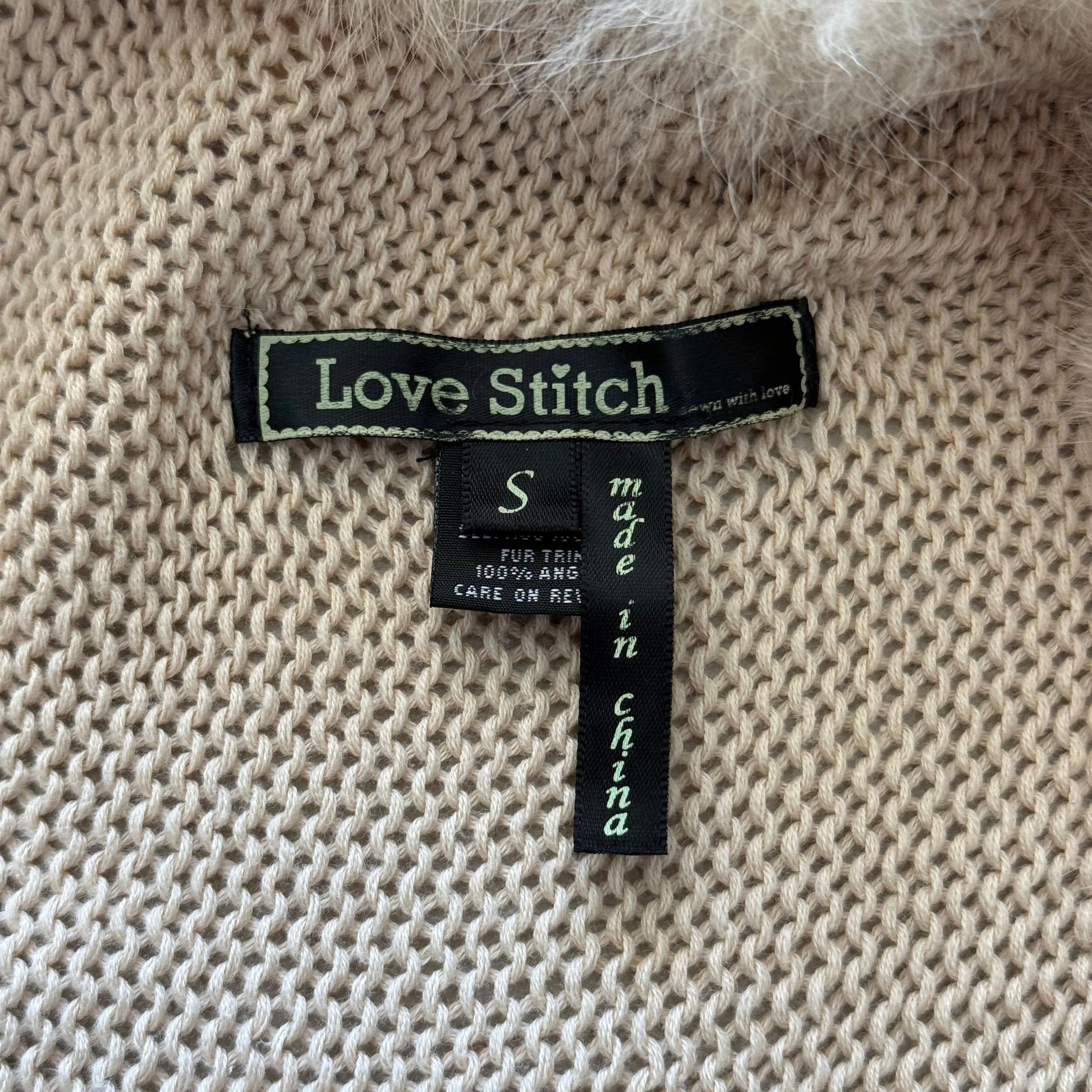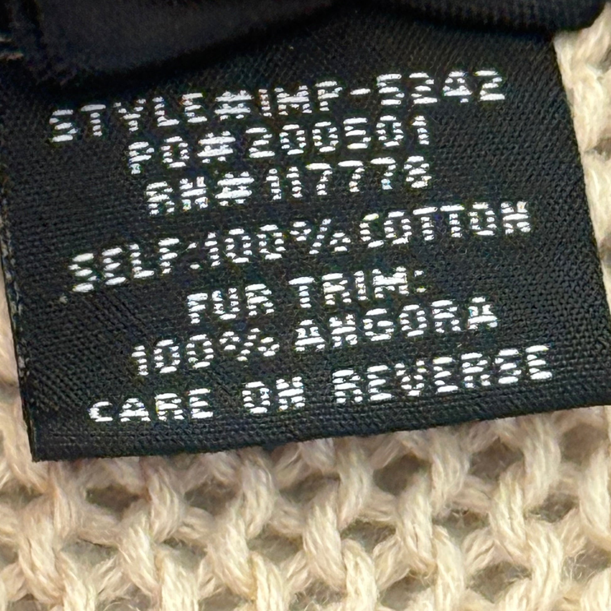 Beige open-front knit vest with knotted plush faux fur trim along the neckline. Sleeveless with an draped hem and fringe detail at the back.