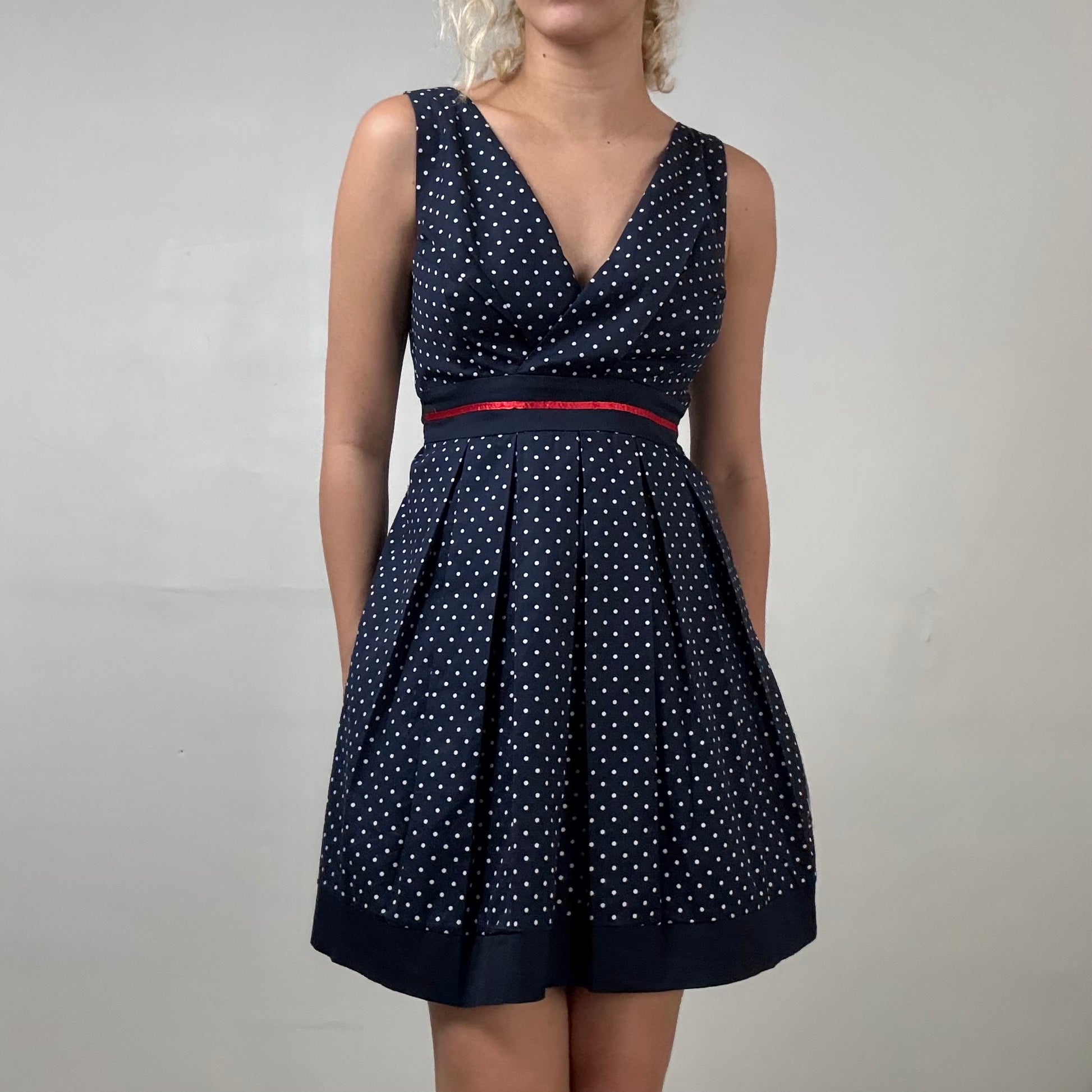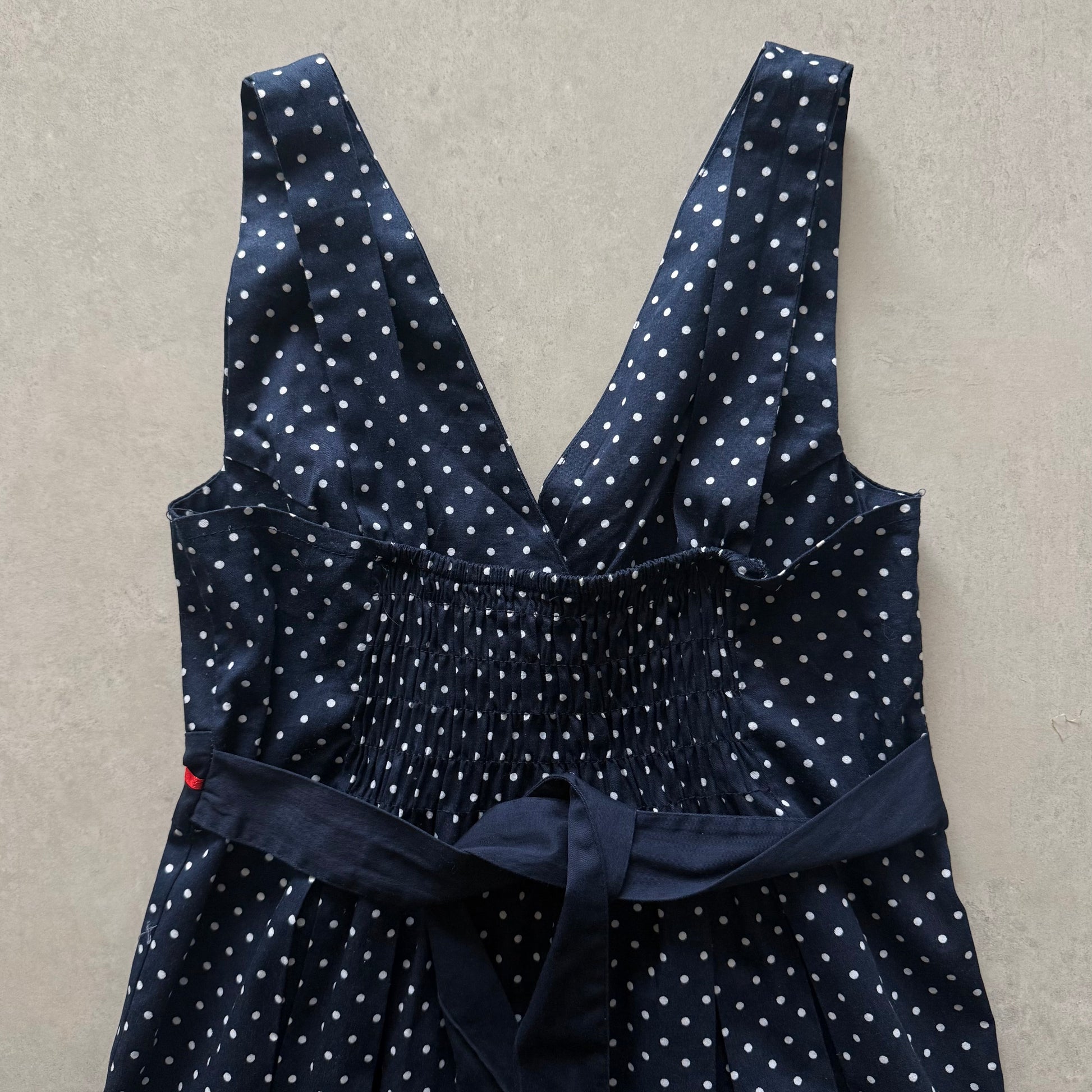 Navy blue sailor style sleeveless flare dress with white polka dot print, wrap-style bust, and pleated skirt. Adjustable tie waist with red trim. Elastic back.