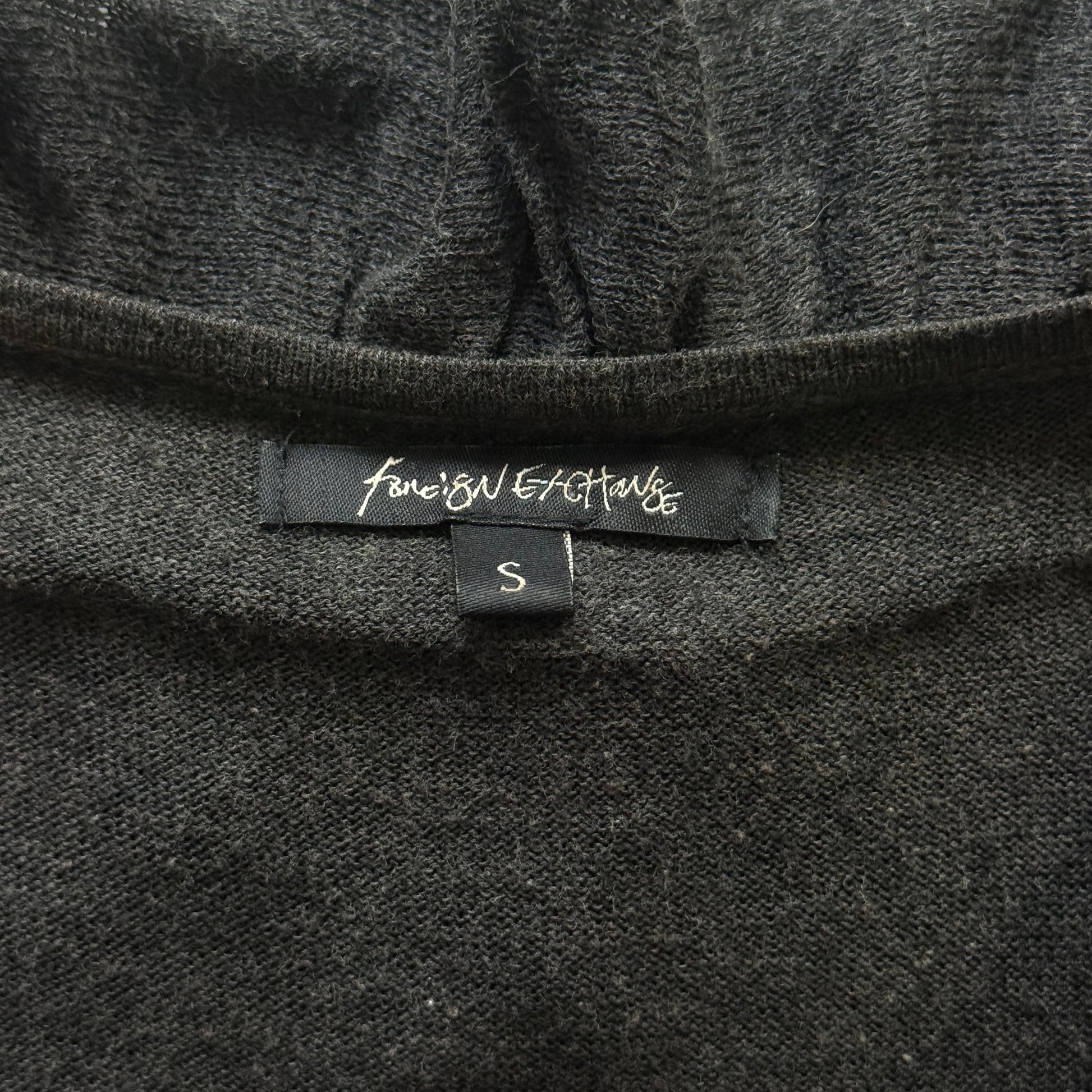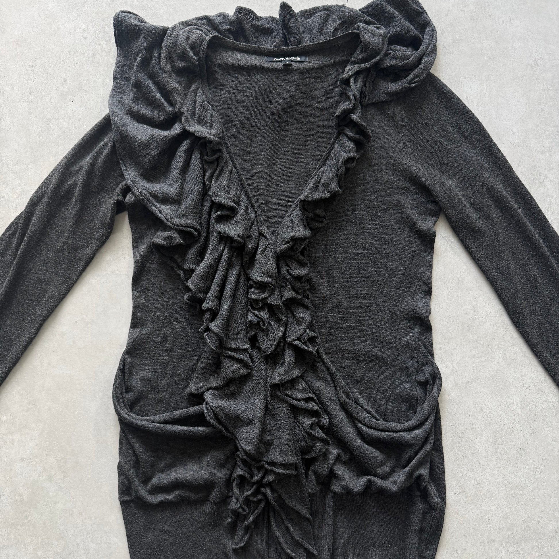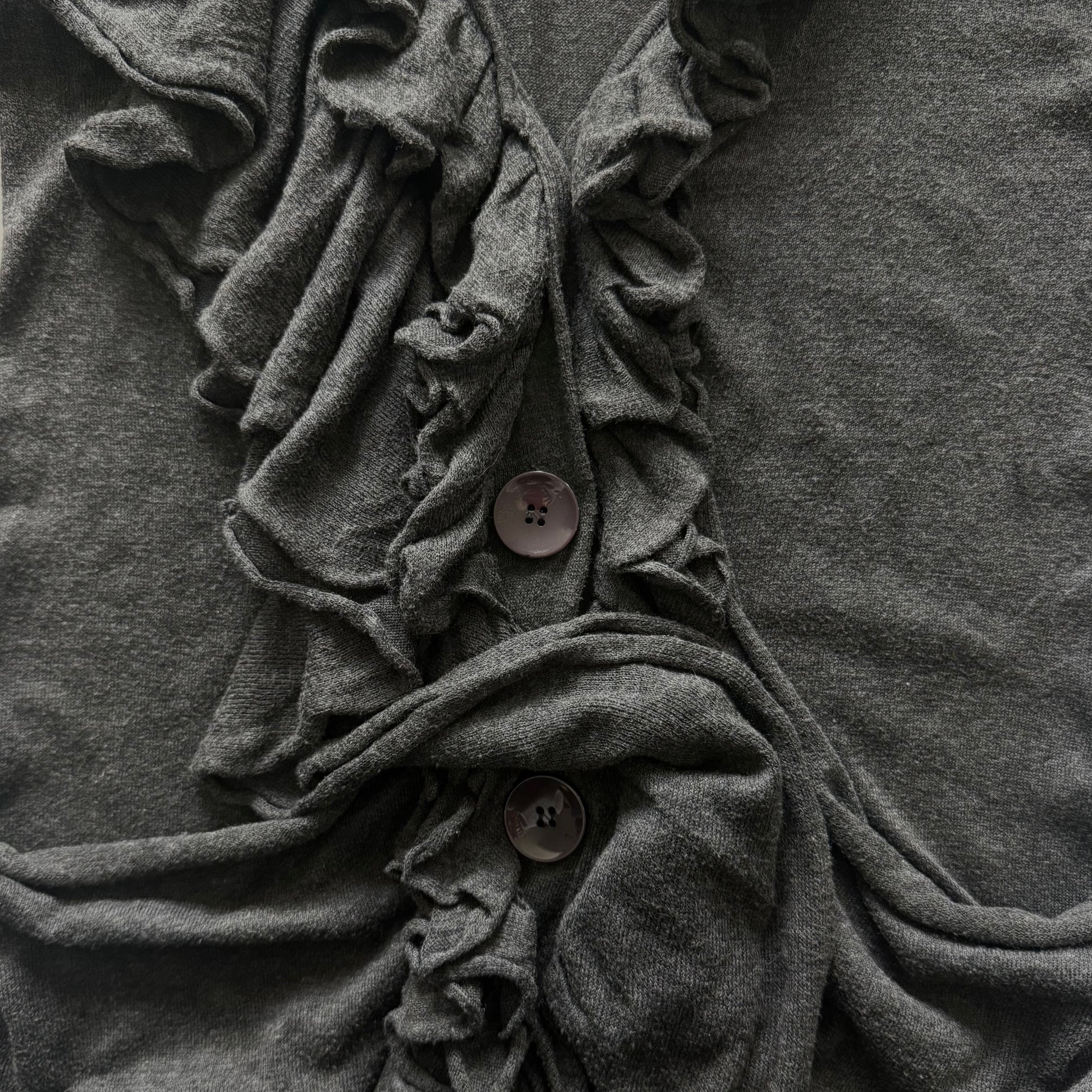 2000s Charcoal open-front cardigan with ruffle waterfall front and draped/slouchy fit. Lightweight knit.