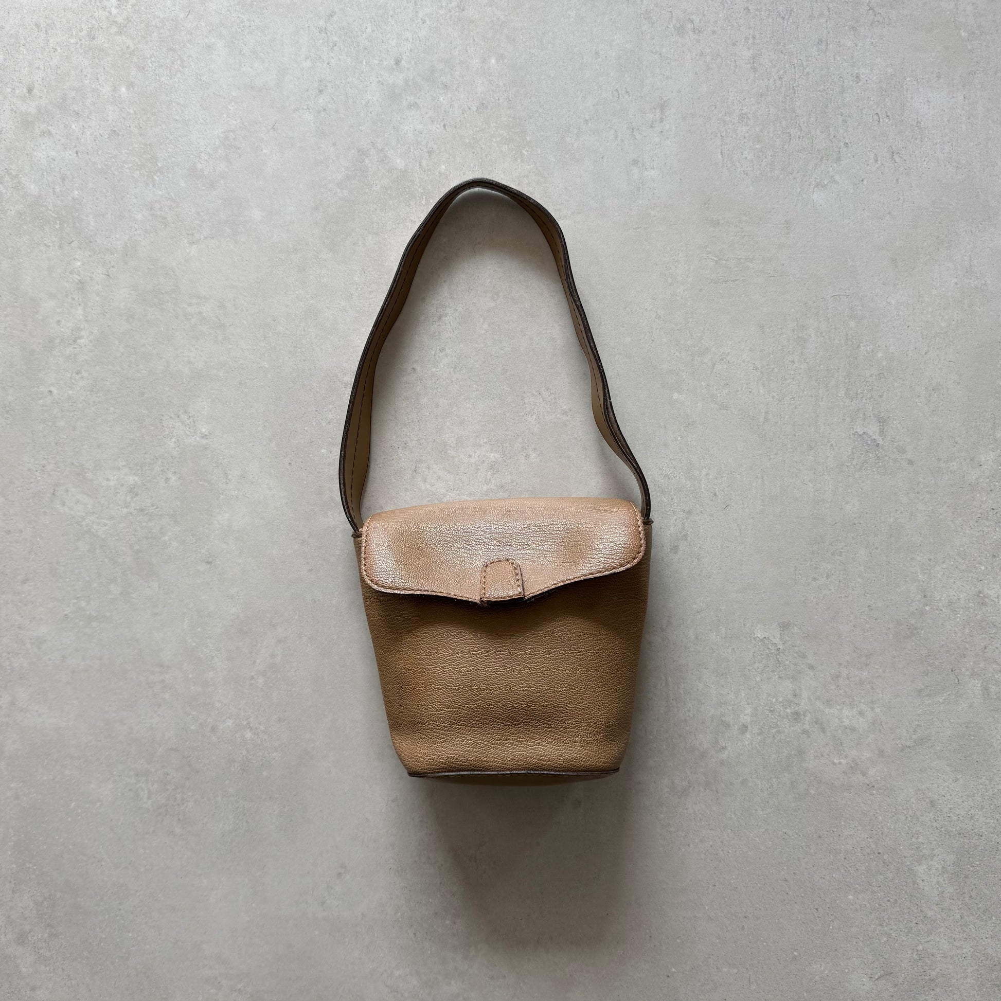 Tan faux leather mini shoulder bag with flap closure and magnetic snap. Structured shape, inner zip pocket.