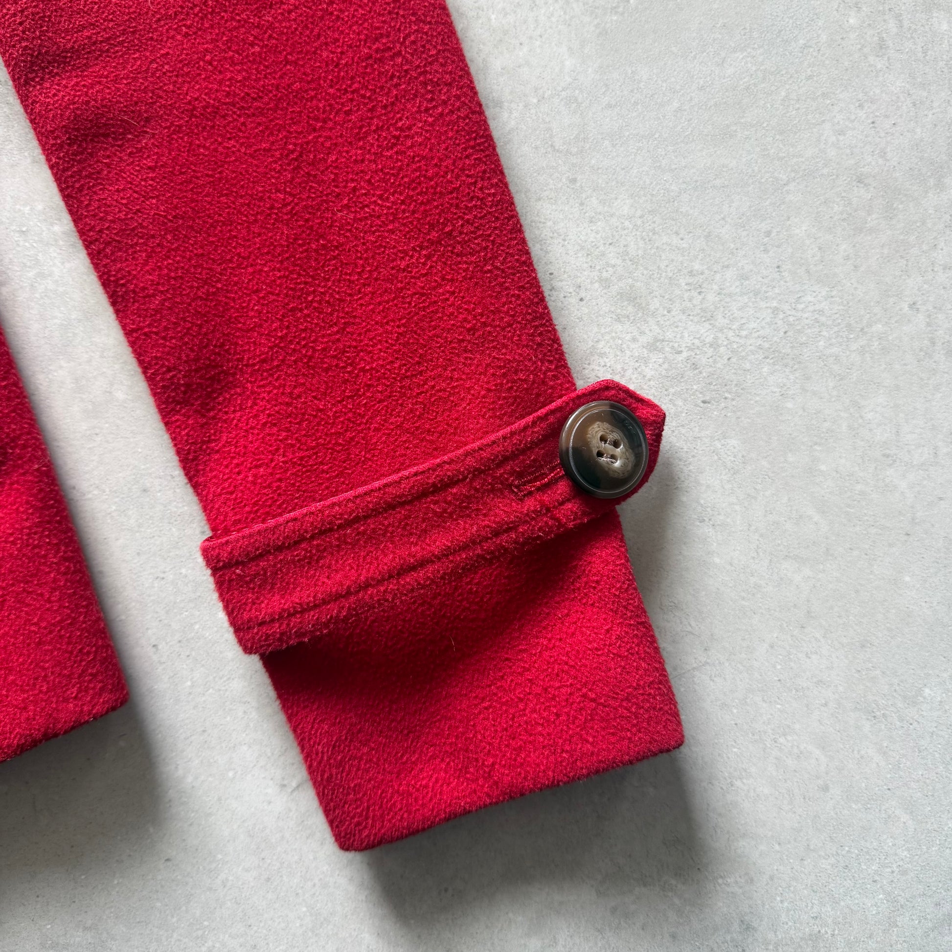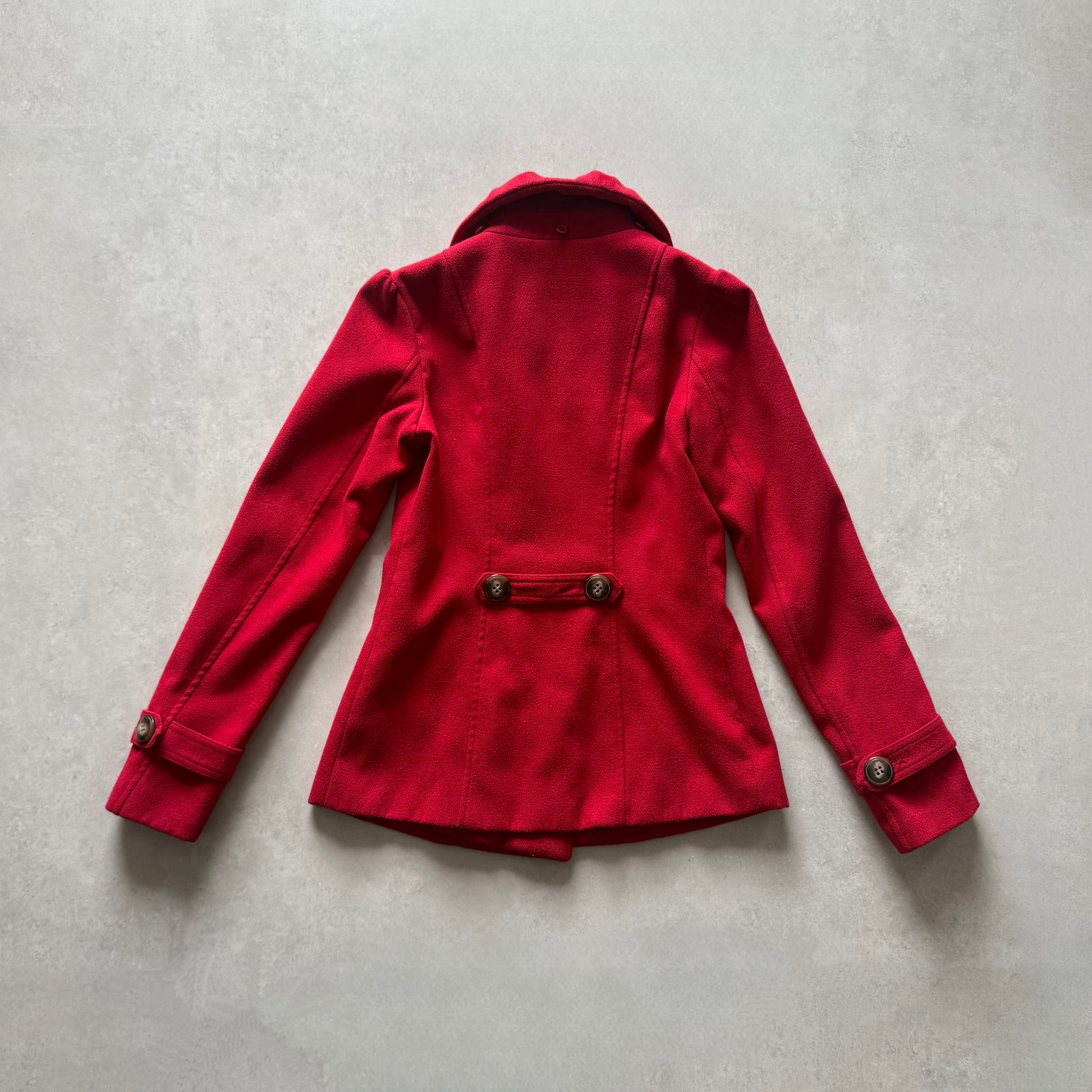 2000s Red fitted military coat with cinched waist, pleated collar, and leopard print lining.