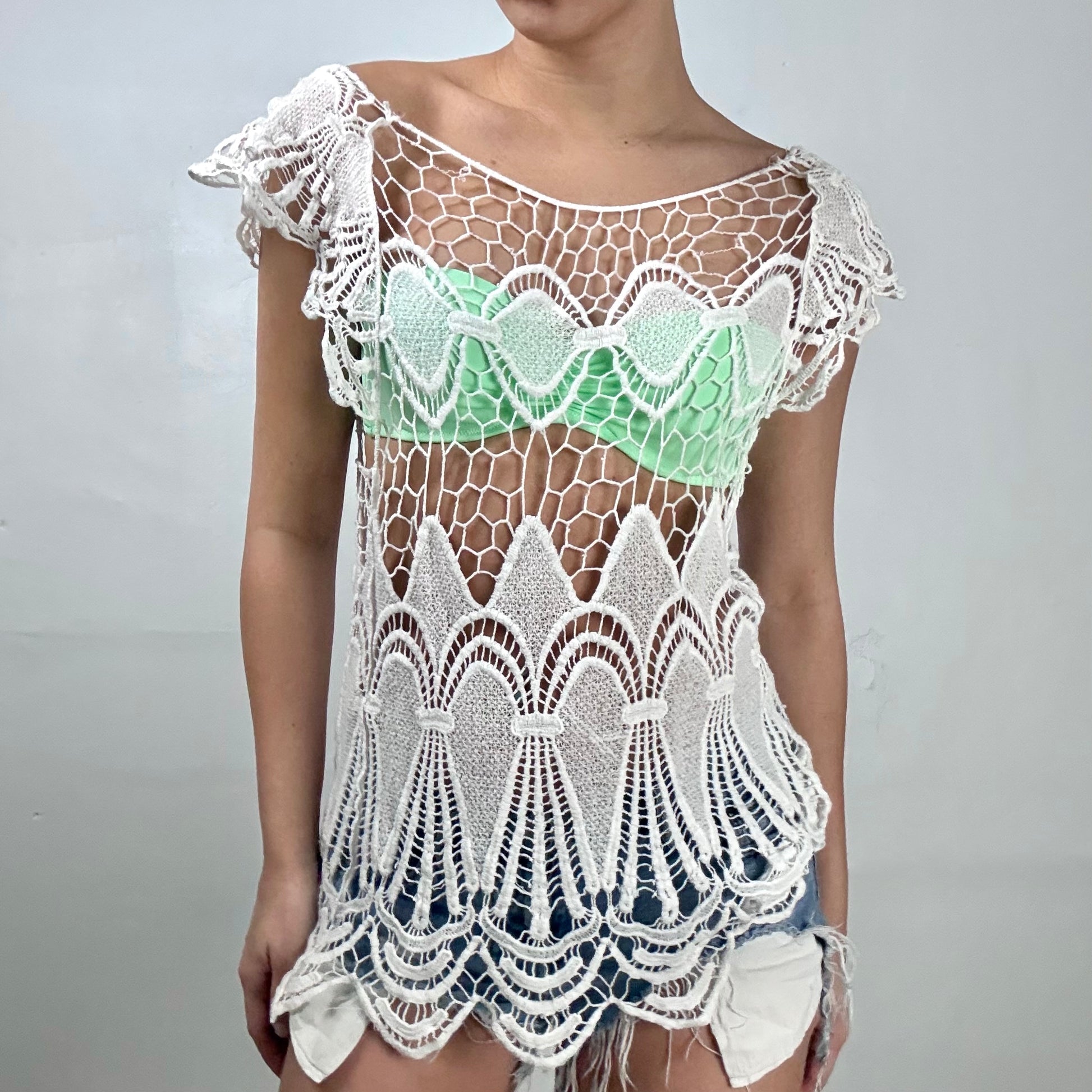 Sheer white crochet lace top with open knit, scalloped hem and cap sleeves. Wide neckline, unlined.