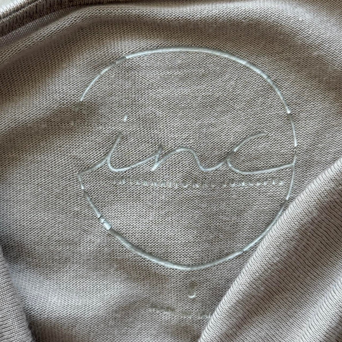 Taupe stretch top with cowl neckline and rhinestone stud detailing throughout the front. Flattering fit & longer length on shirt.