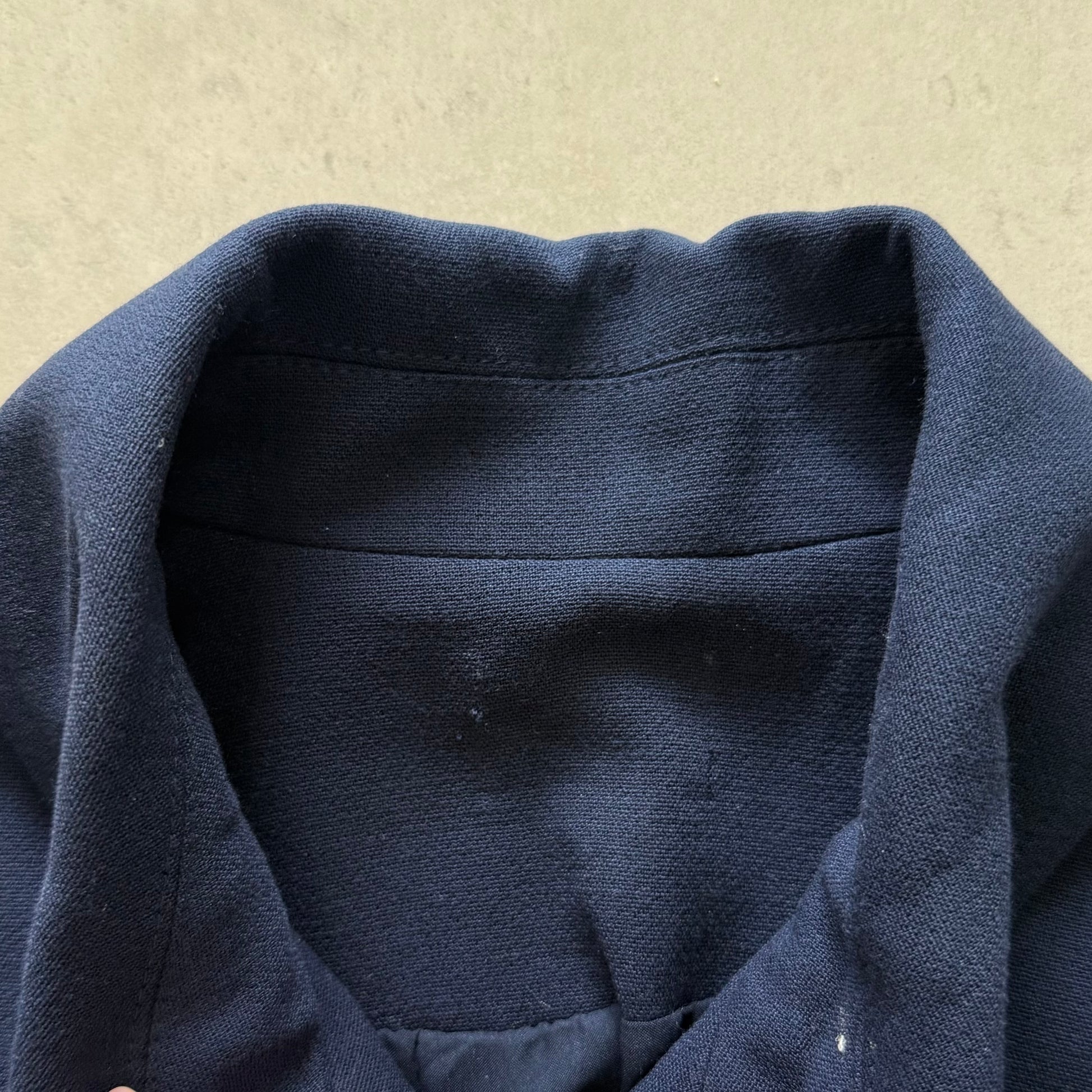 Navy blue jacket with stand collar and gold button detailing (hook and eye used for front closures). Shoulder epaulettes functional and front flap pockets with gold piping.