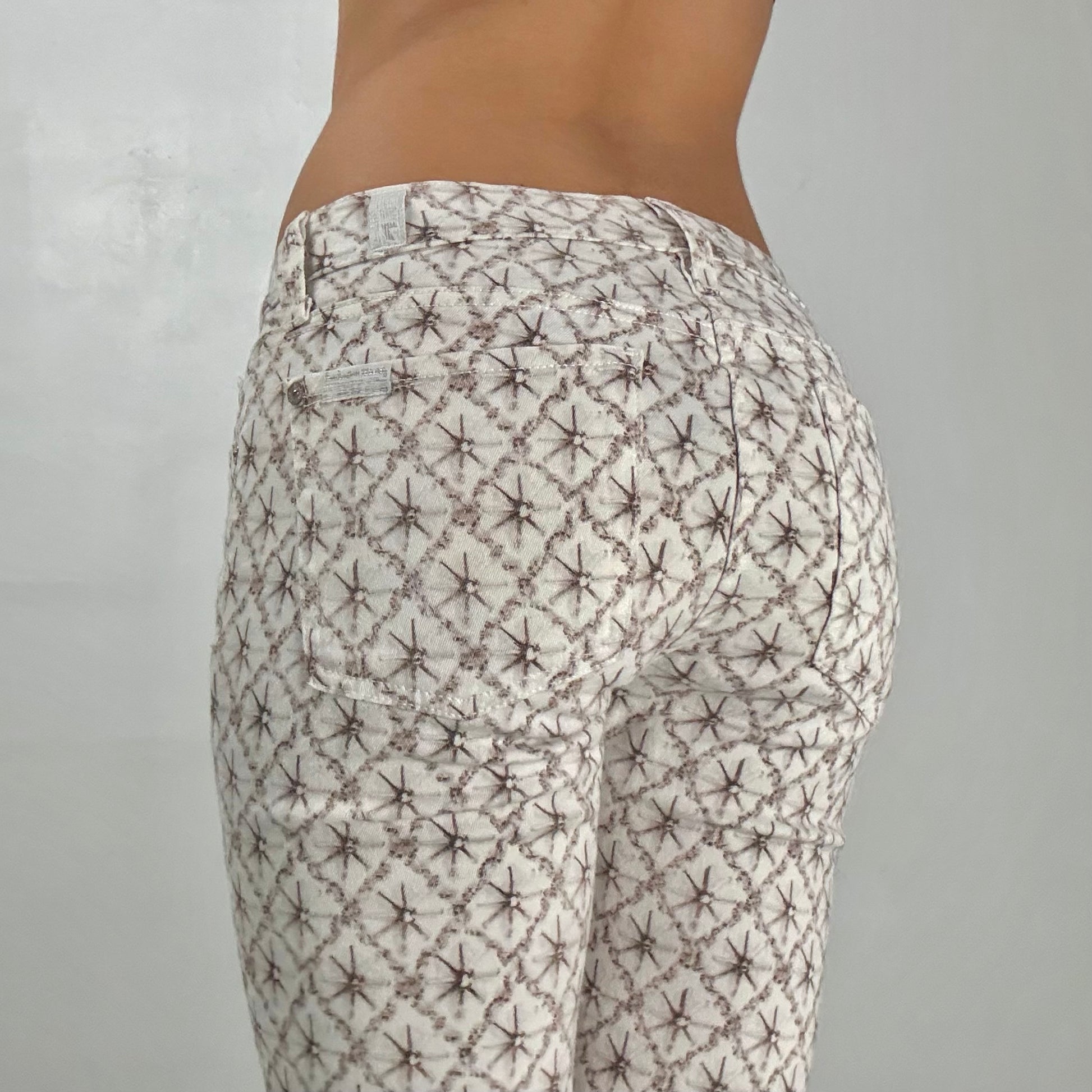 White and grey jeans with an allover star print and subtle bedazzled details. Stretchy material.