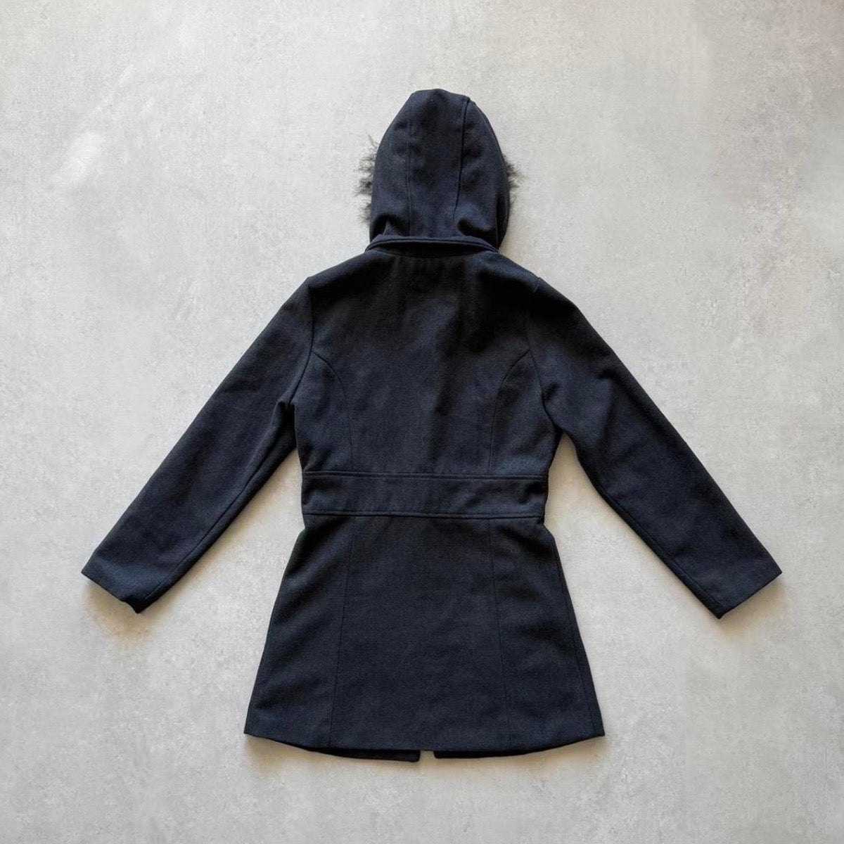 2000s Dark grey wool-blend coat with faux fur hood and leopard satin lining. Toggle front with hidden snap buttons.