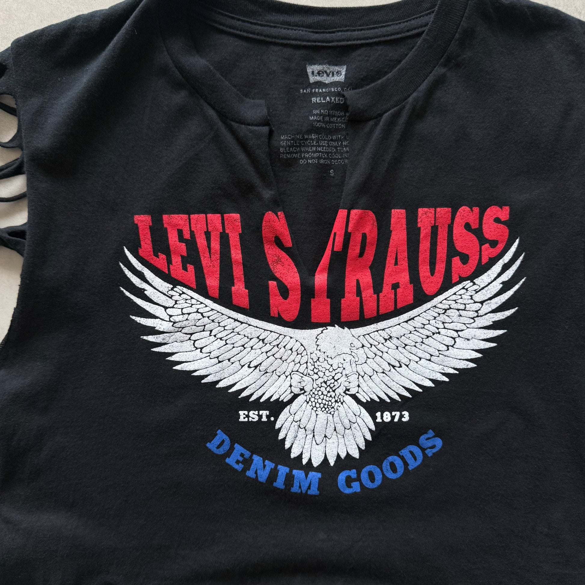 Black cotton sleeveless crop top with Levi’s Strauss eagle graphic on front. Hand-cut fringe detail along the hem and sleeves.