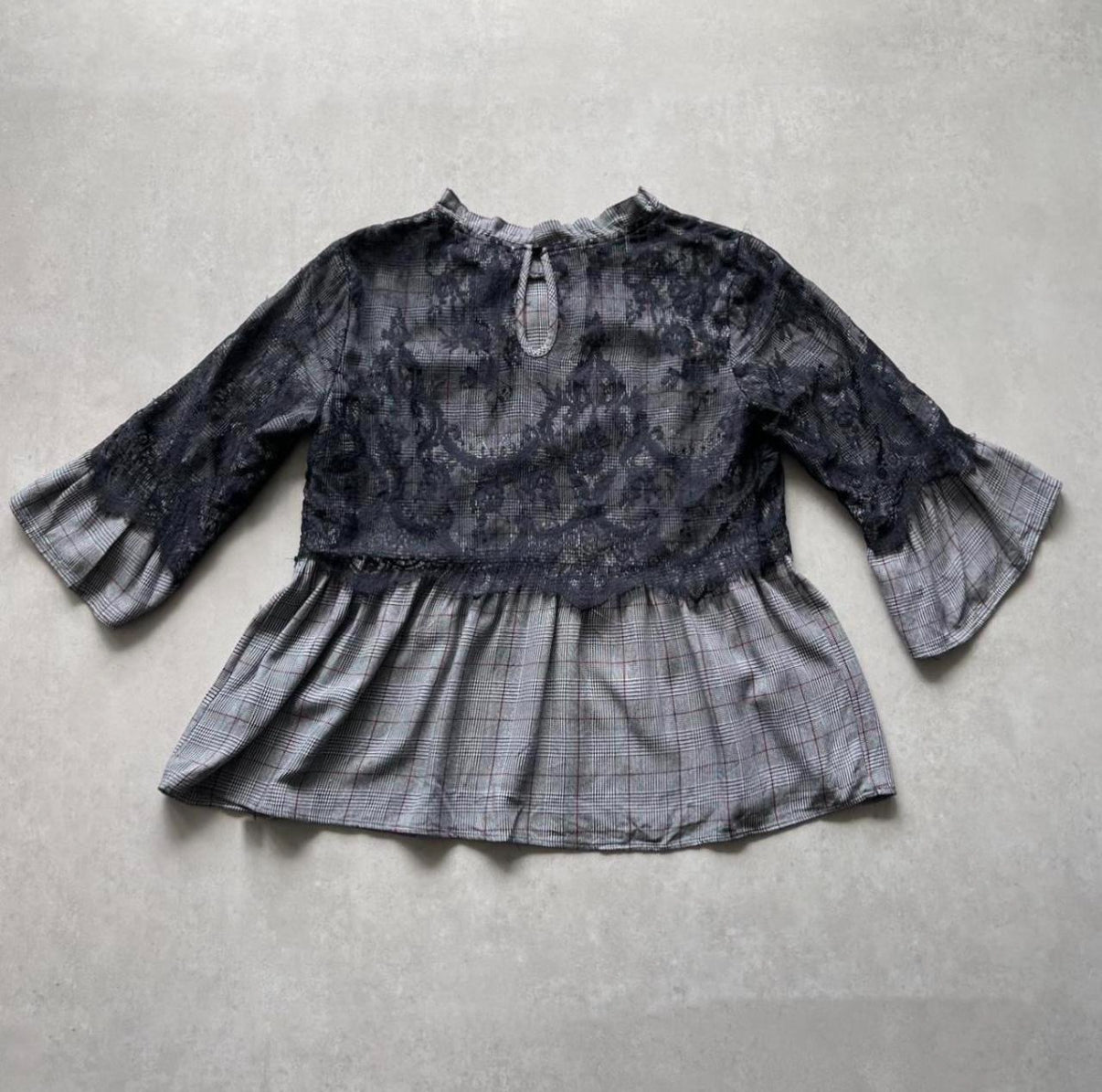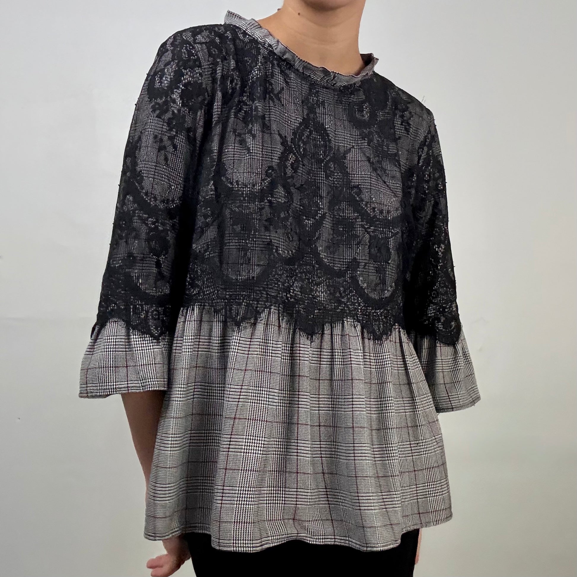 Multicolor plaid blouse in with sheer lace overlay on the bodice and sleeves. High neckline with back keyhole, babydoll fit, and bell 3/4 sleeves.