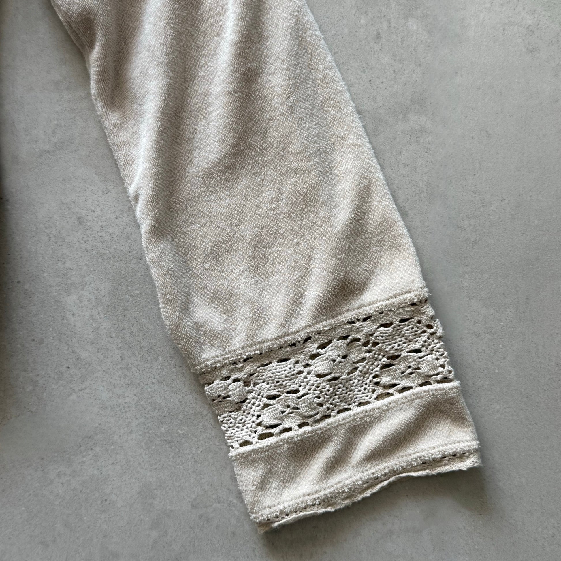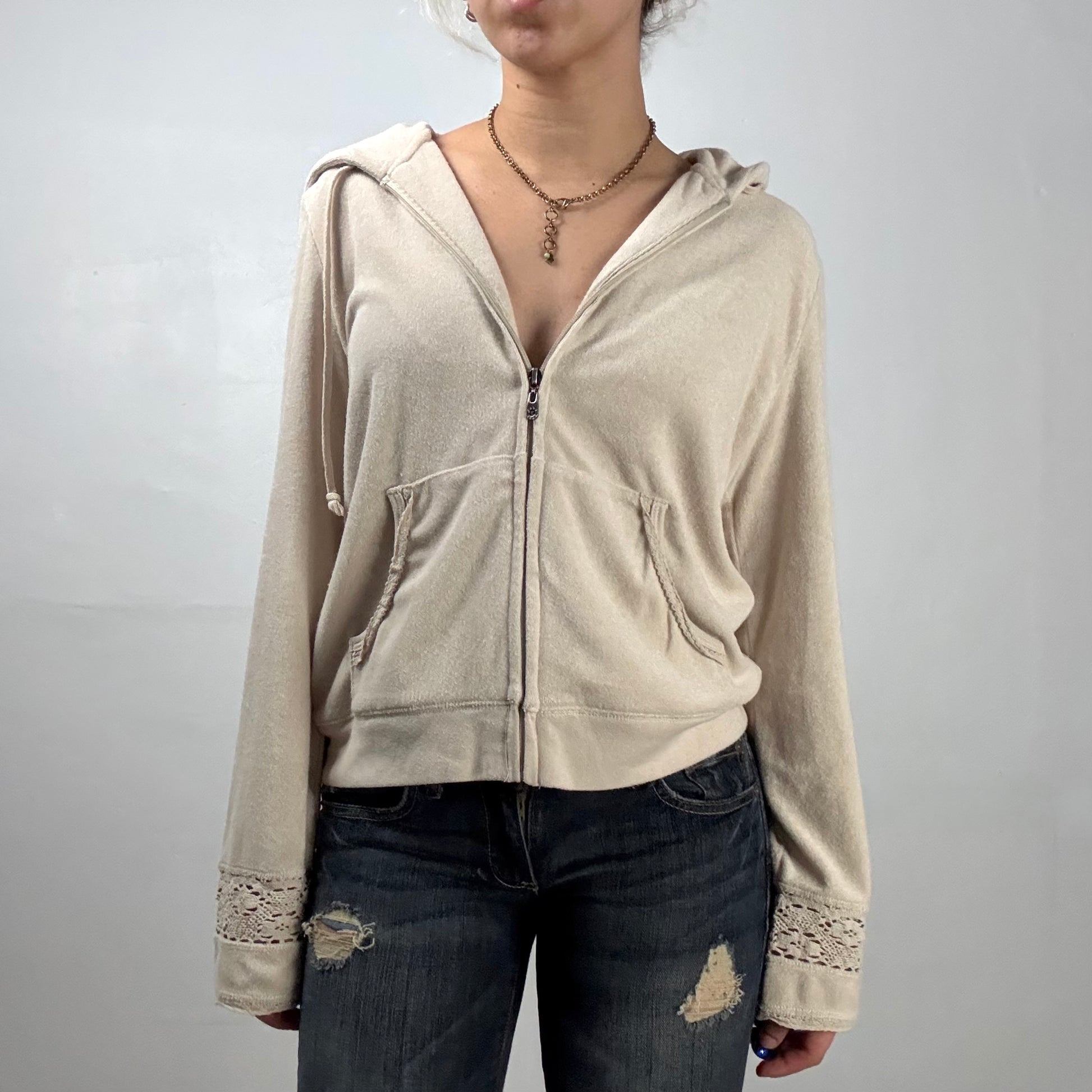Cream/beige terry zip-up hoodie with drawstring hood and pockets. Lace crochet panel at sleeve cuffs.