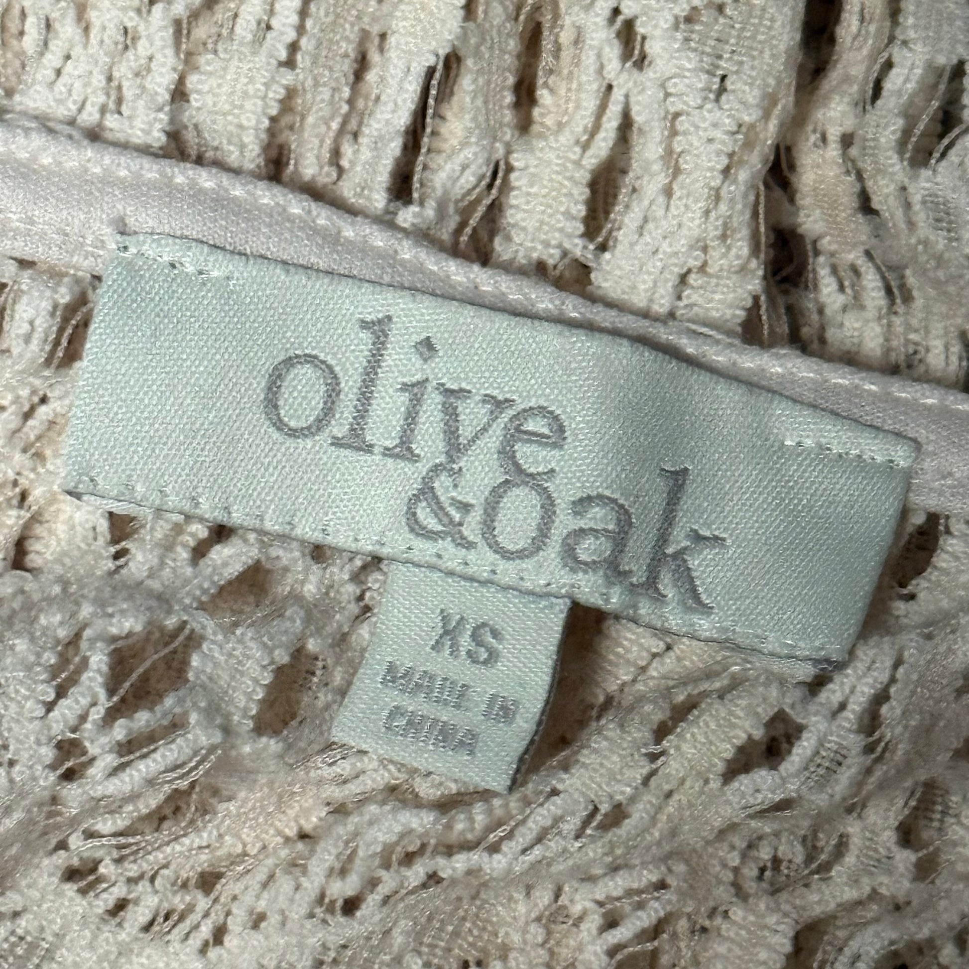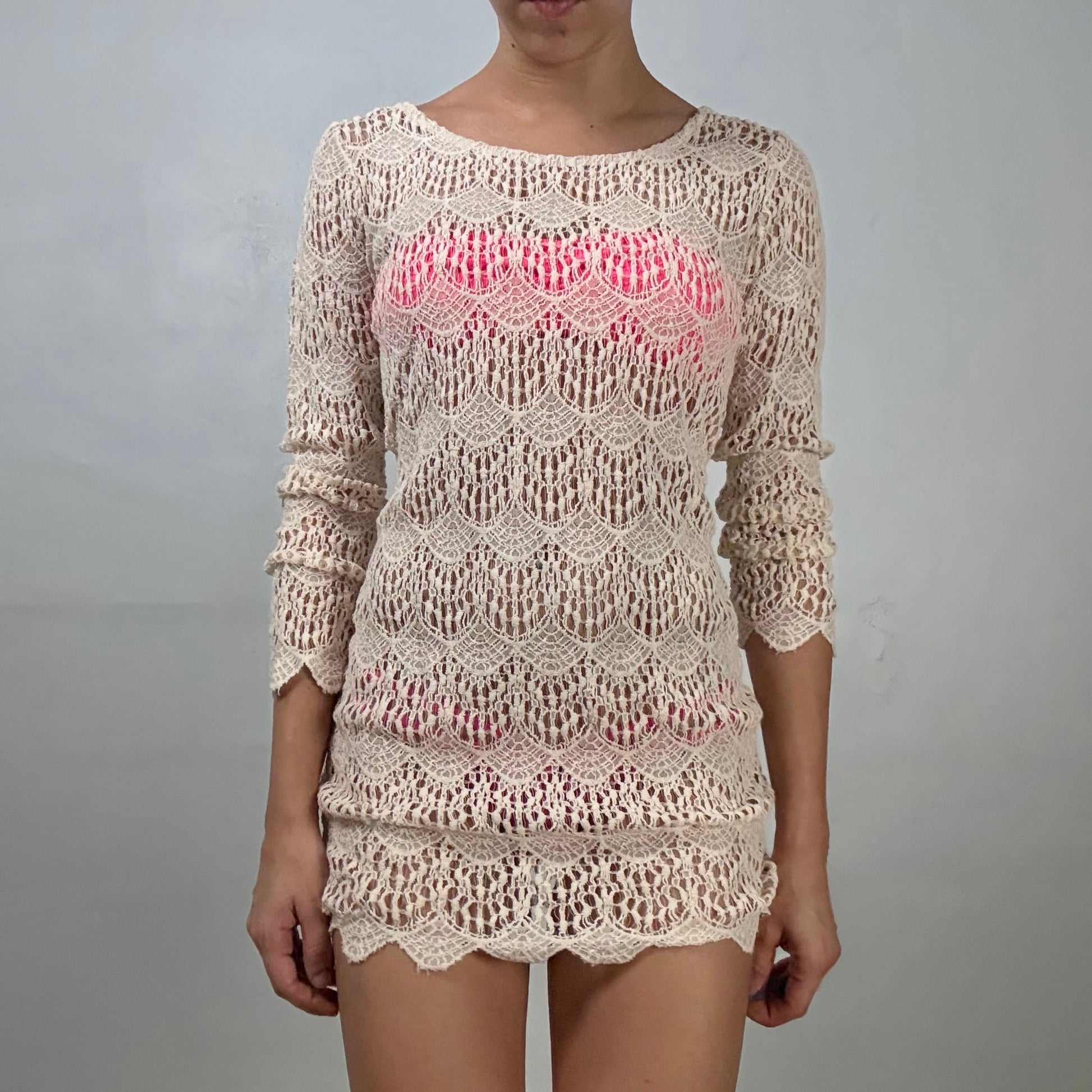 Cream lace mini with long sleeves, scalloped hem, and a fitted shape. Keyhole back and button closure.