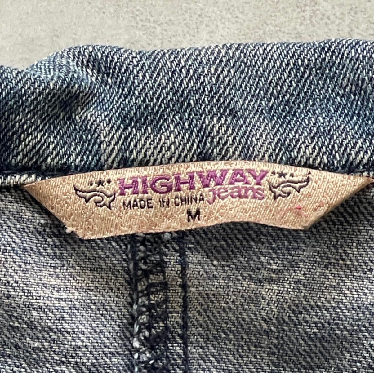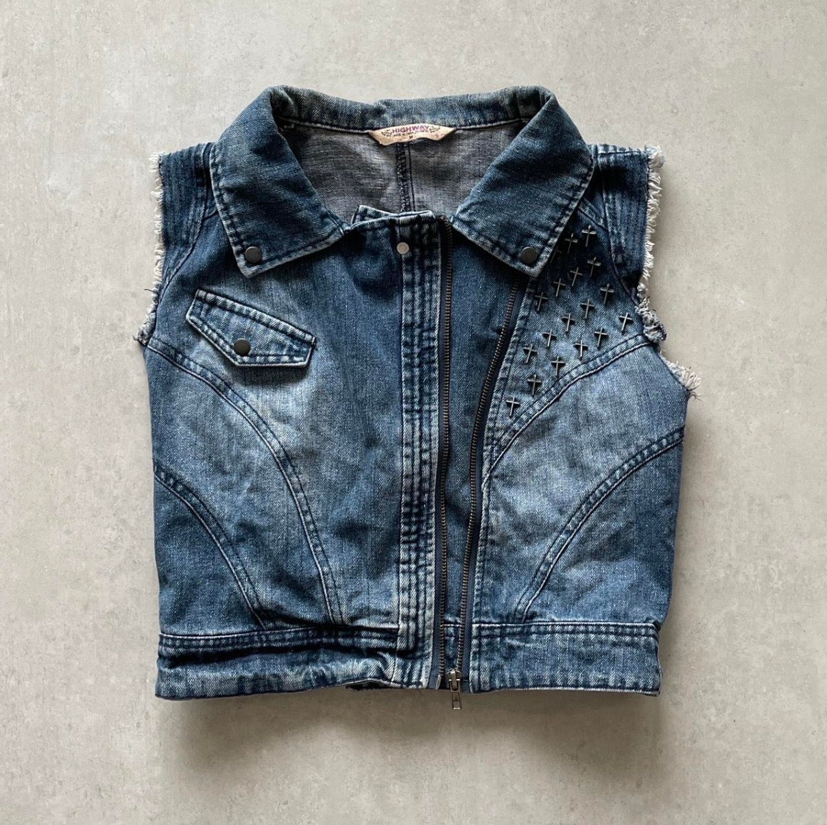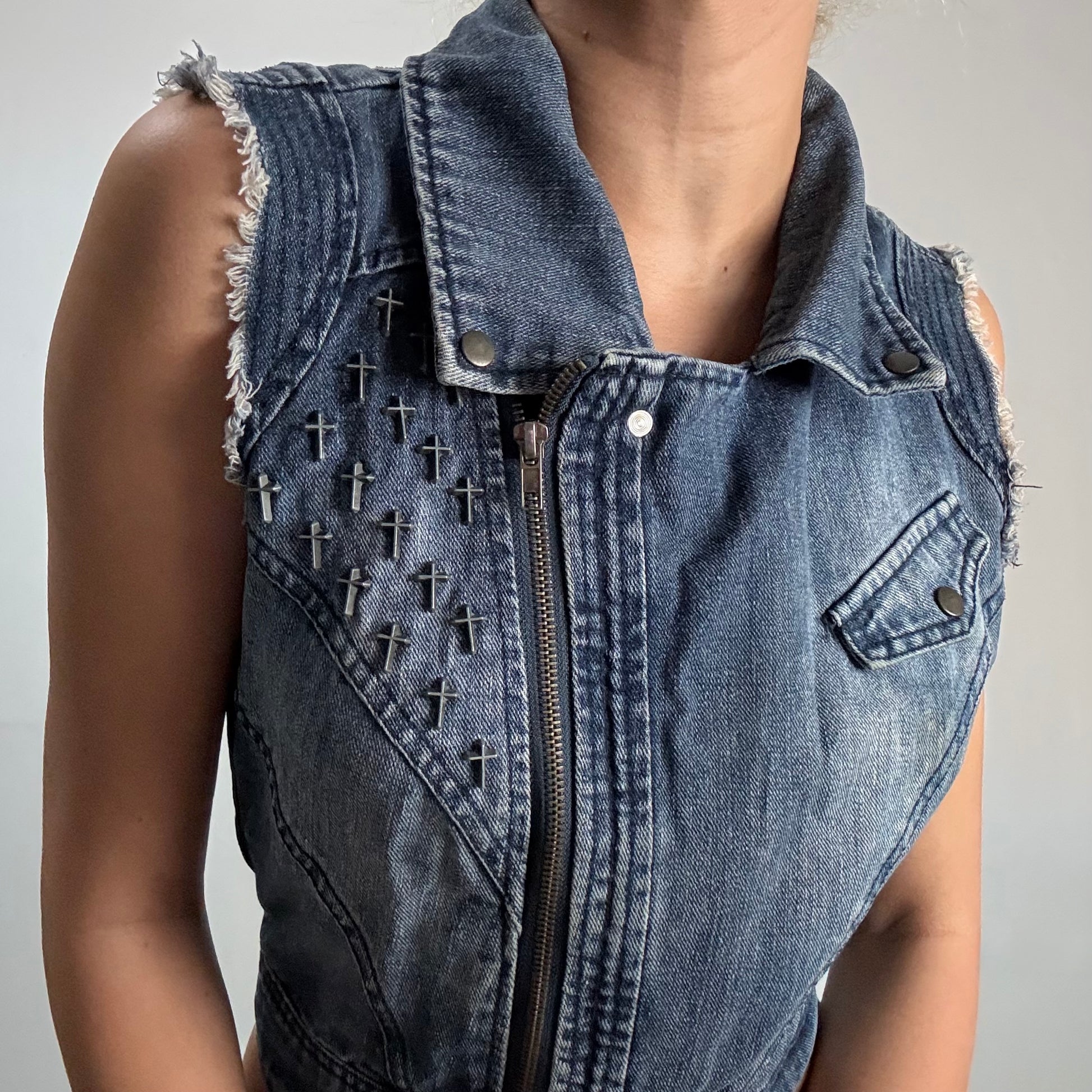 Dark-wash jean biker vest with frayed edges, asymmetrical zip, and metal cross studs.