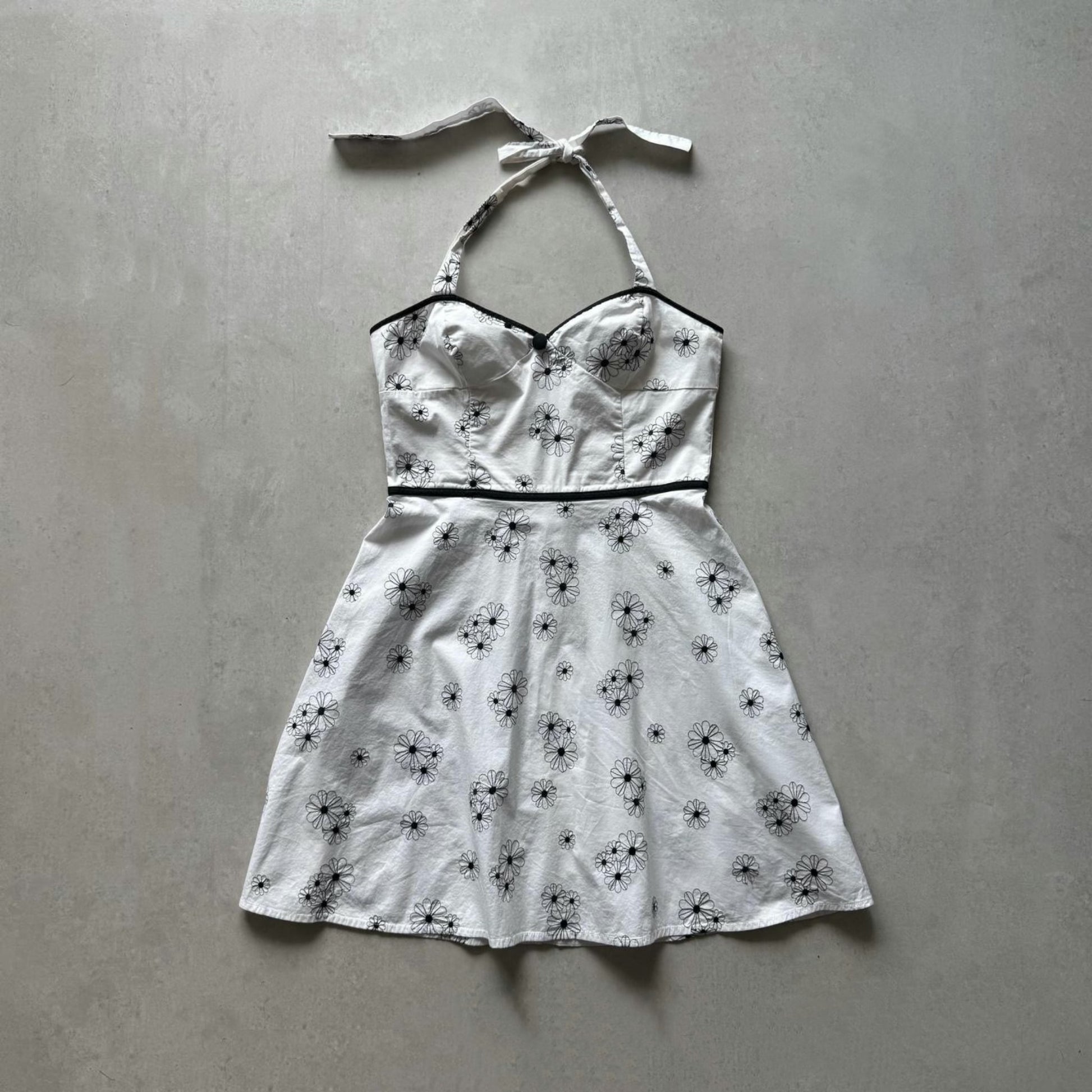 2000s White halter mini dress with black daisy embroidery and retro button detail. Tie neck, back zip, and babydoll shape.