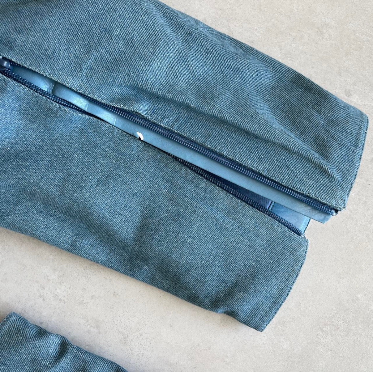 Blue denim boots with shark boot/fold over design and pointed toe. Mid-calf length.