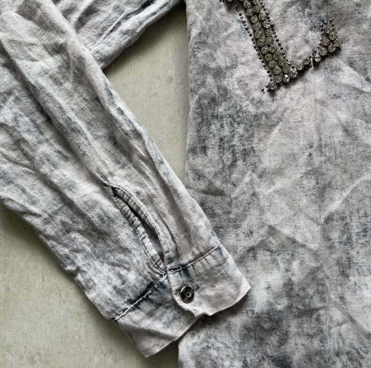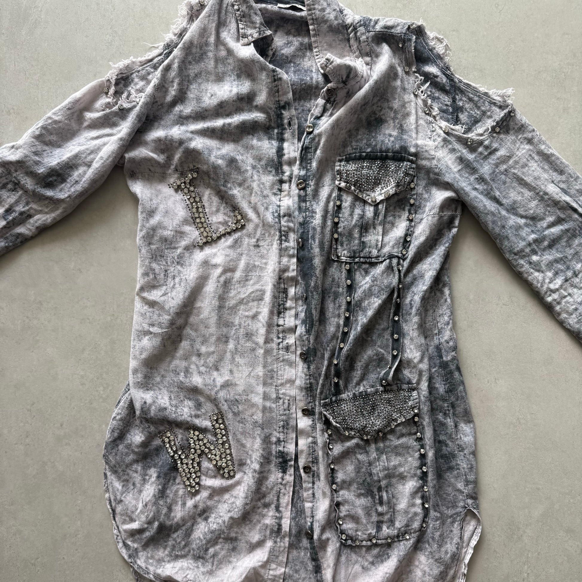 Washed grey and black denim button-up with cold shoulders, rhinestone L/W patches, and studded pockets. Mid-thigh length.