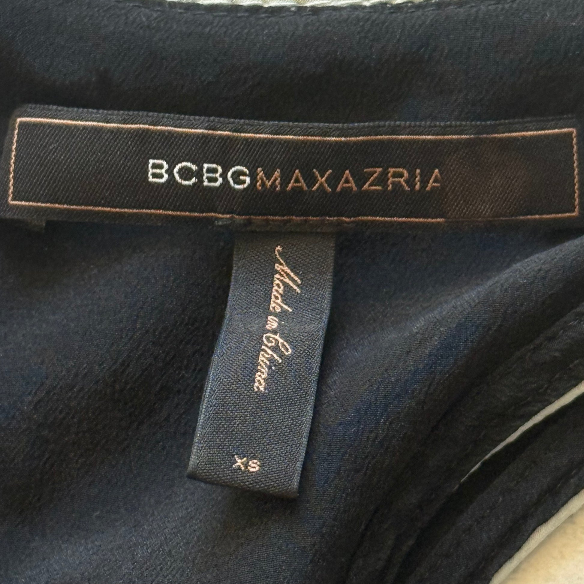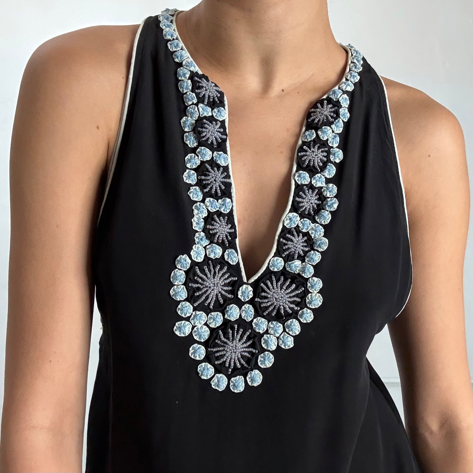 Black mini dress with pale blue floral bead embroidery and white piping. Lightweight drapey fabric with a racerback cut.
