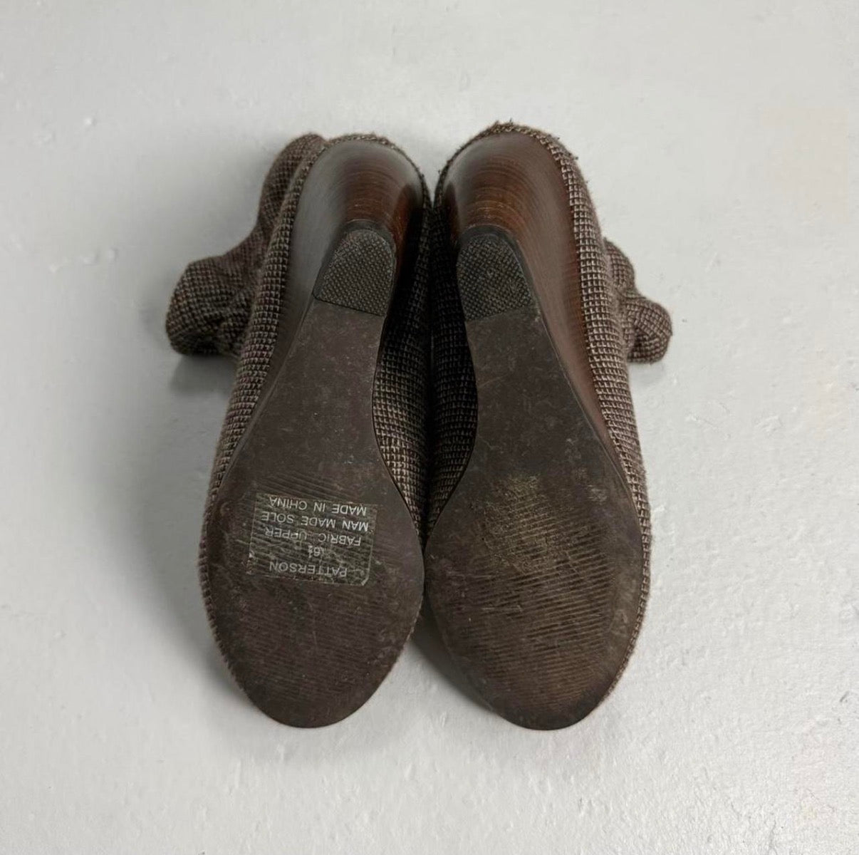 Grey & brown textured ankle boots with a slouchy fit and wooden wedge heel. Rounded toe with a fabric upper.