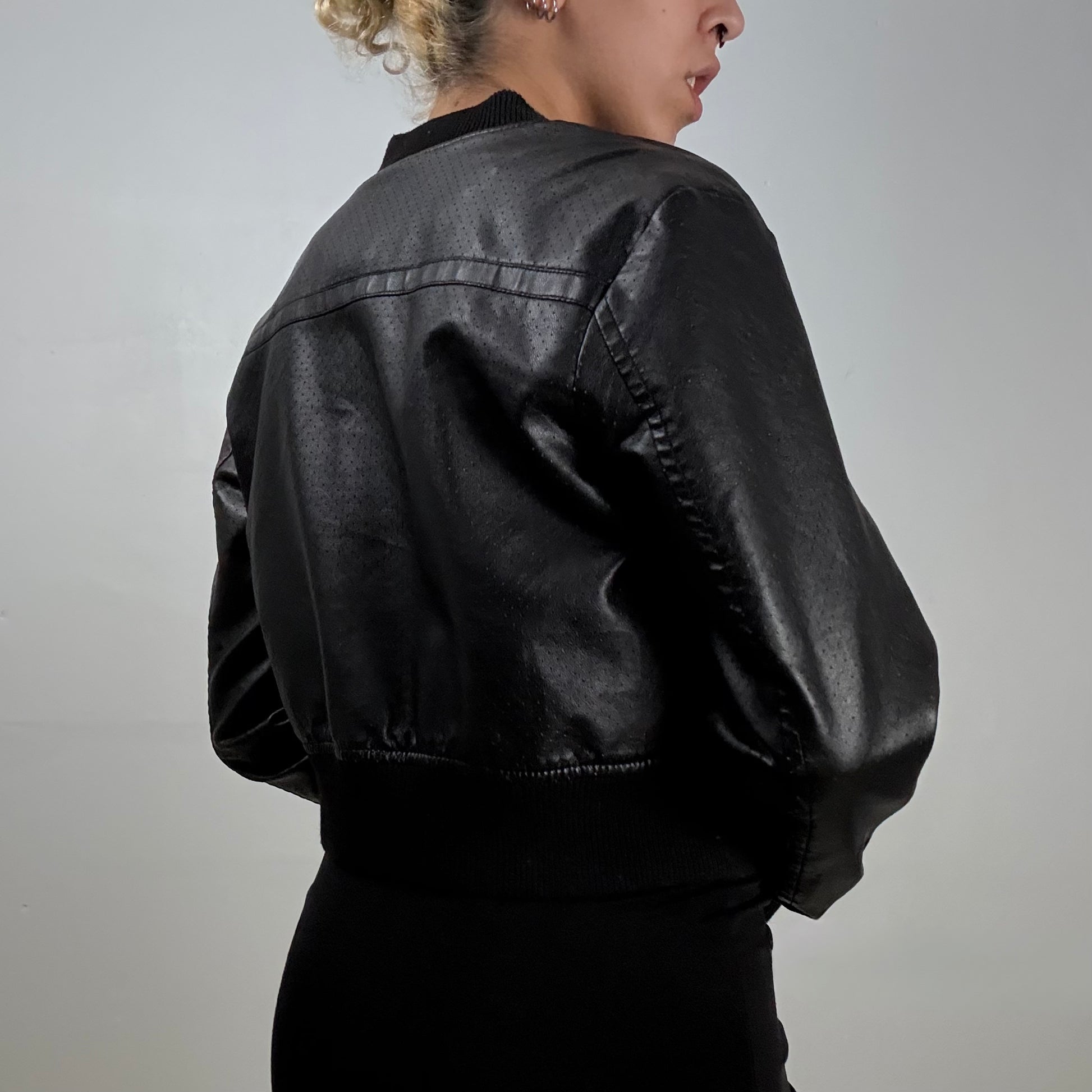 90s Cropped faux leather jacket with zip front and fabric ribbed trim. Dotted texture.