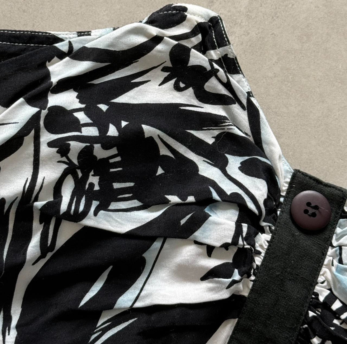 Black and white leaf print, pointed sweetheart neckline, and pointed wiring at hem. Front button up detail with back zip.