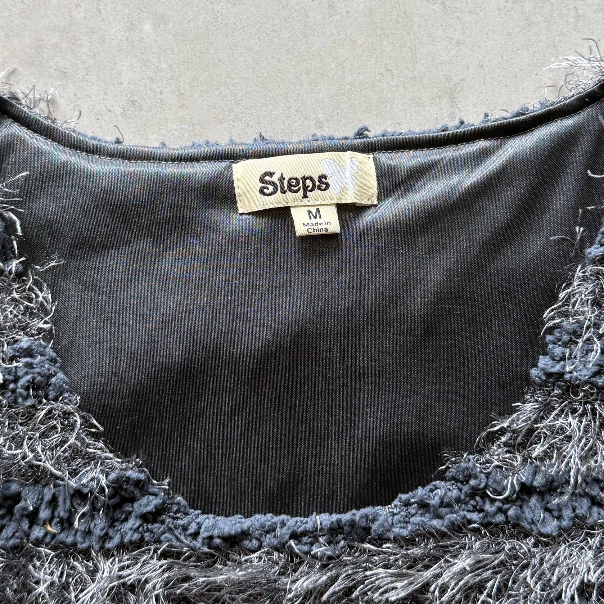 Textured charcoal grey fuzzy knit mini dress with horizontal stripe texture. Sleeveless scoop neckline with shaggy knit fabric and slight A-line silhouette. Fully lined.