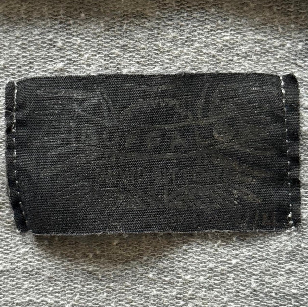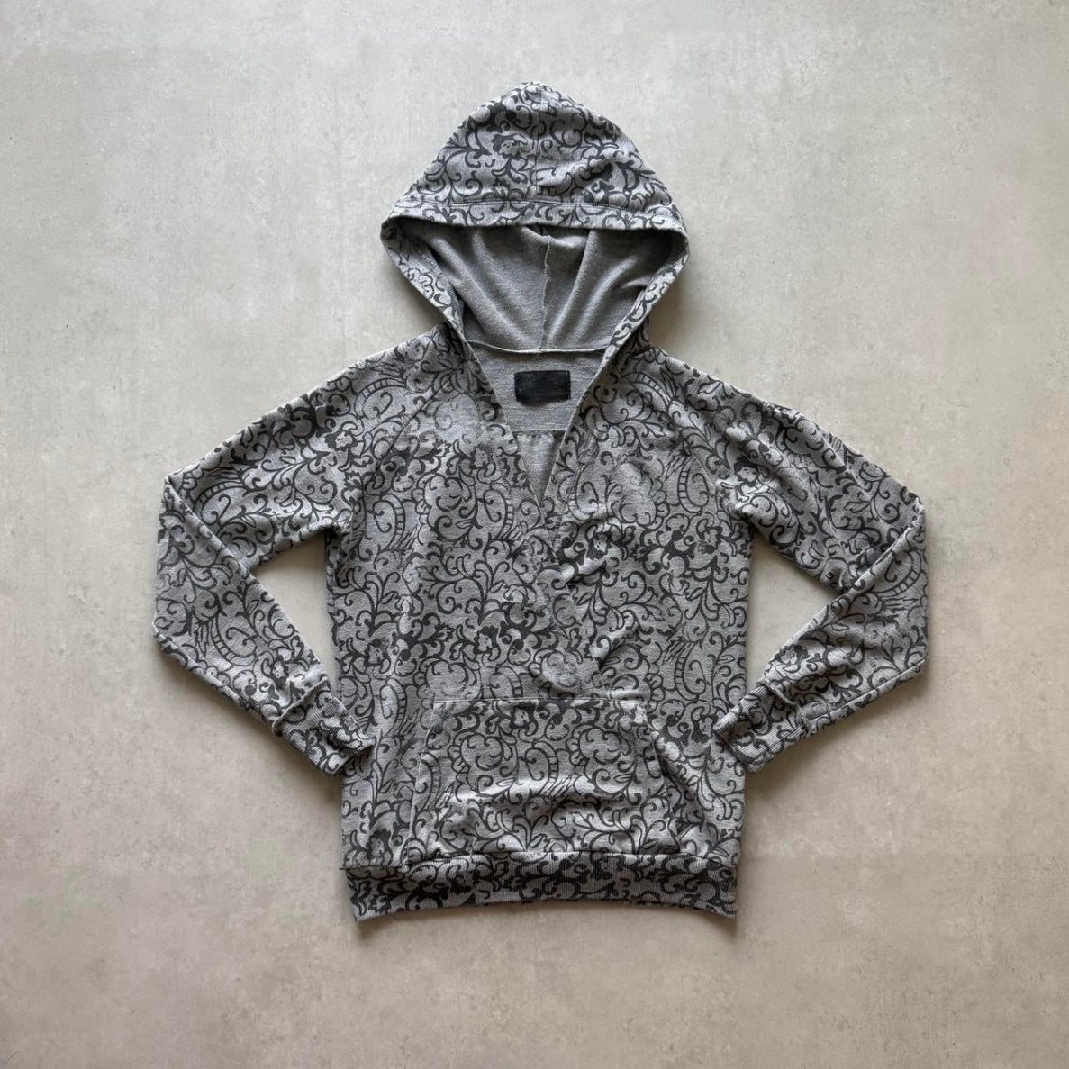 Heather grey knit hoodie with black faded gothic swirl print. Deep-V neckline, roomy hood, kangaroo pocket.