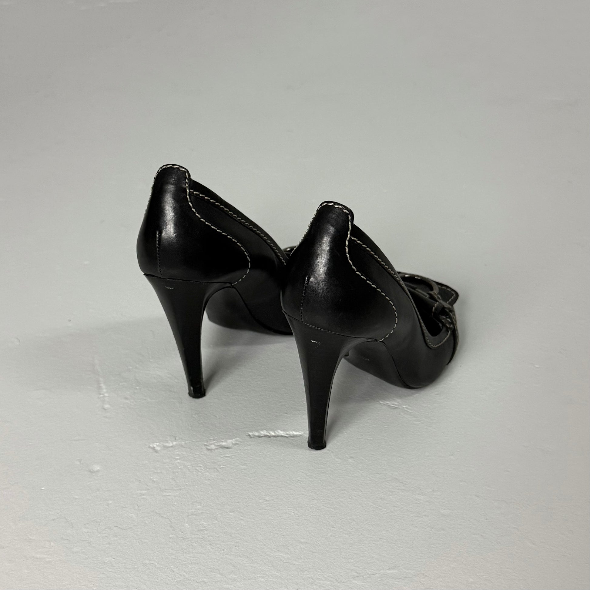 Black leather heels with contrast stitching and silver buckle detail at the toe. Rounded toe with stiletto heel.