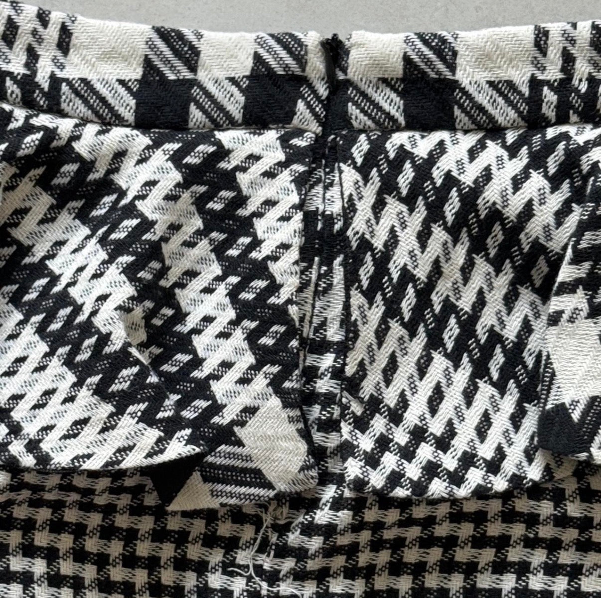 Black & White houndstooth mini with plaid paneling and a peplum ruffle waist. Heavyweight woven fabric with full lining and hidden back zip.