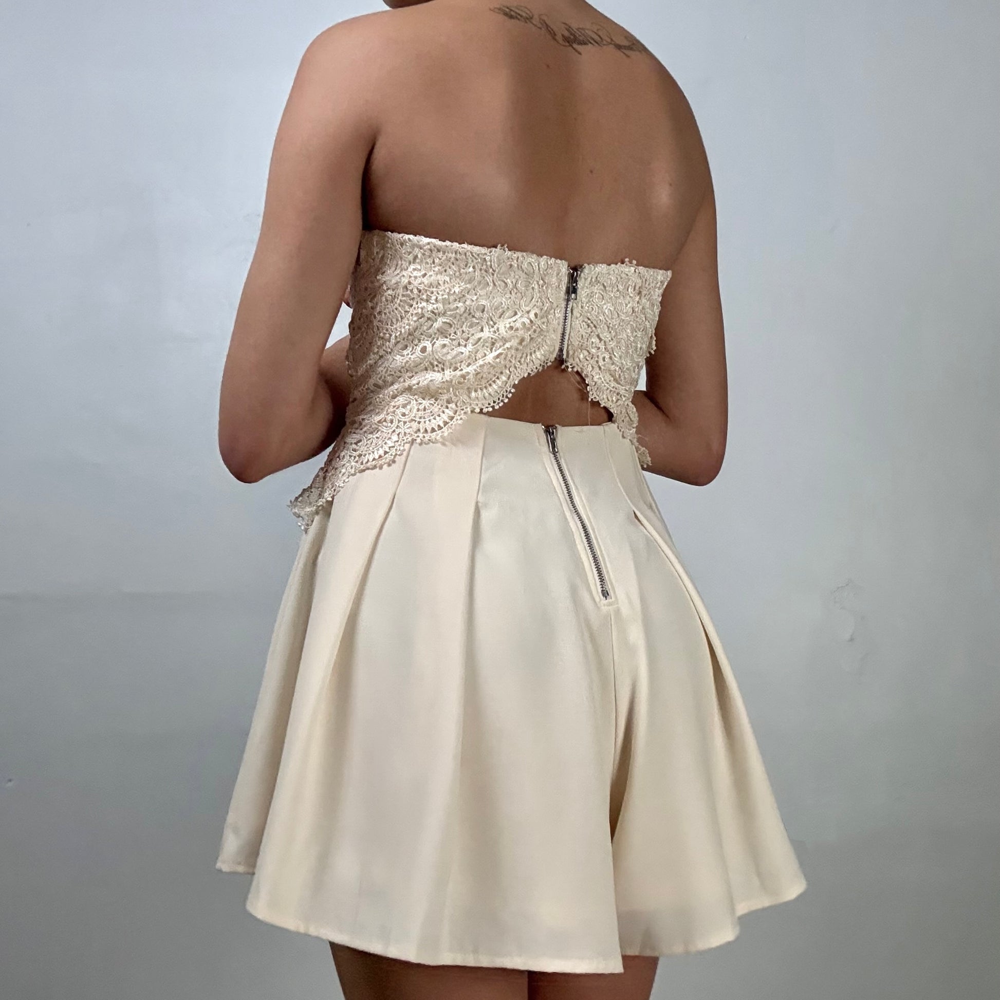 Strapless lace corset style top with padded cups. Attached pleated shorts with hidden back zip & full lining.