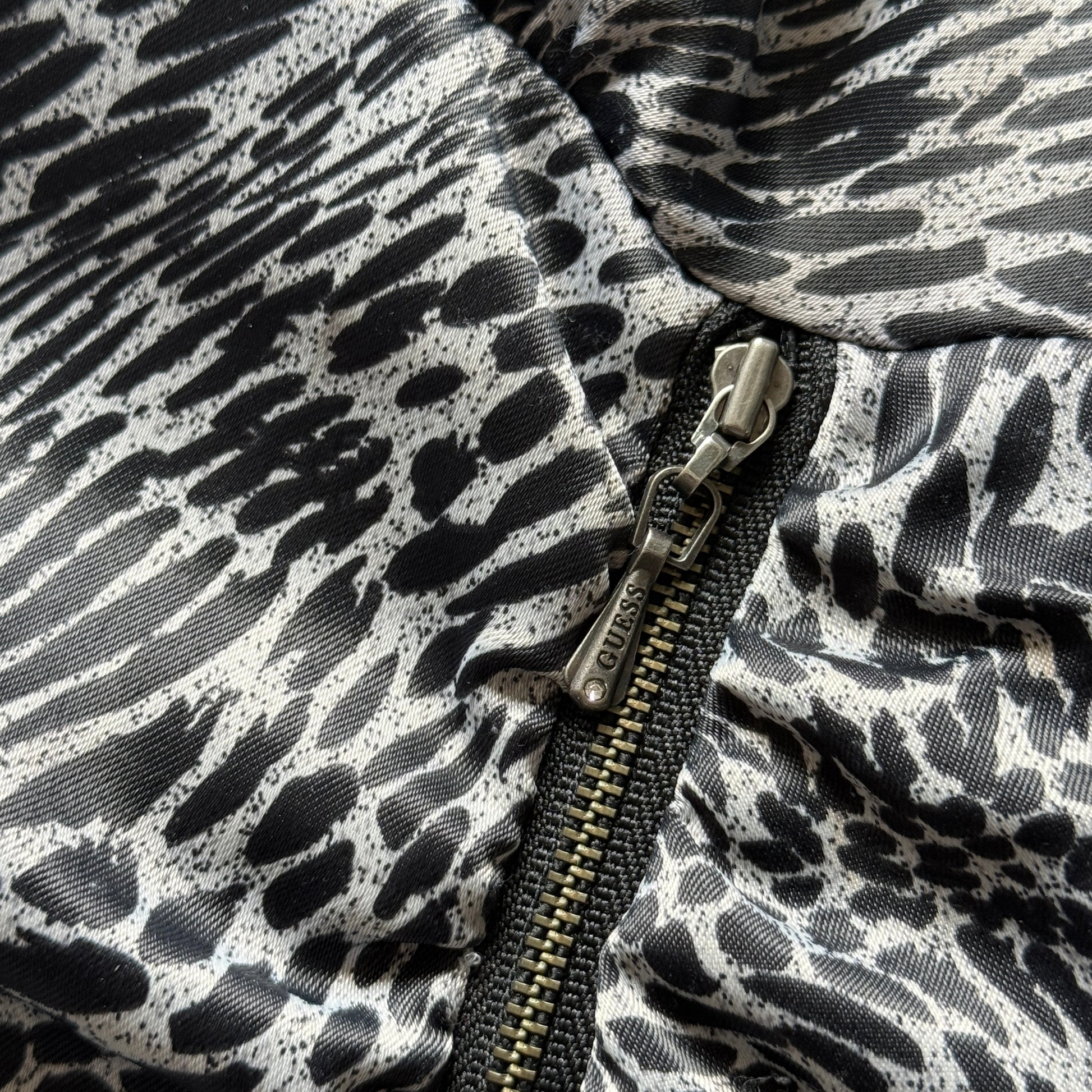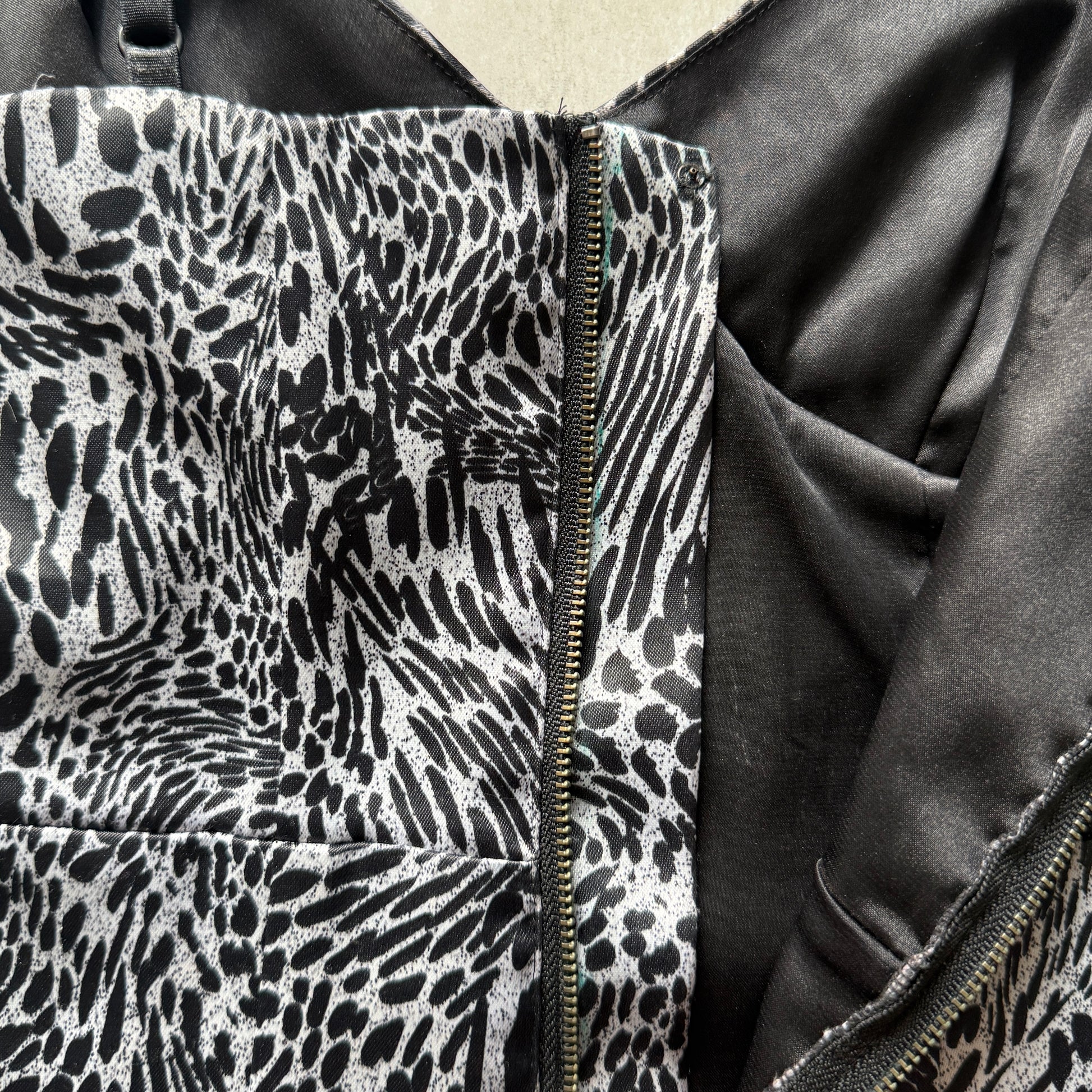 Satin mini dress with leopard print and diagonal zipper. Adjustable straps, and ruched front.