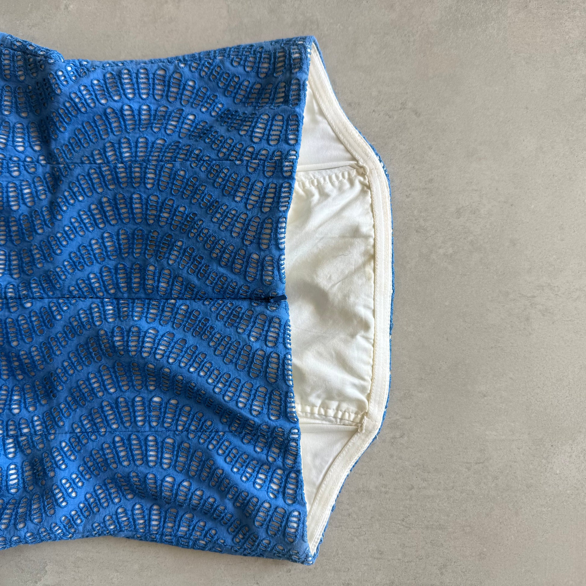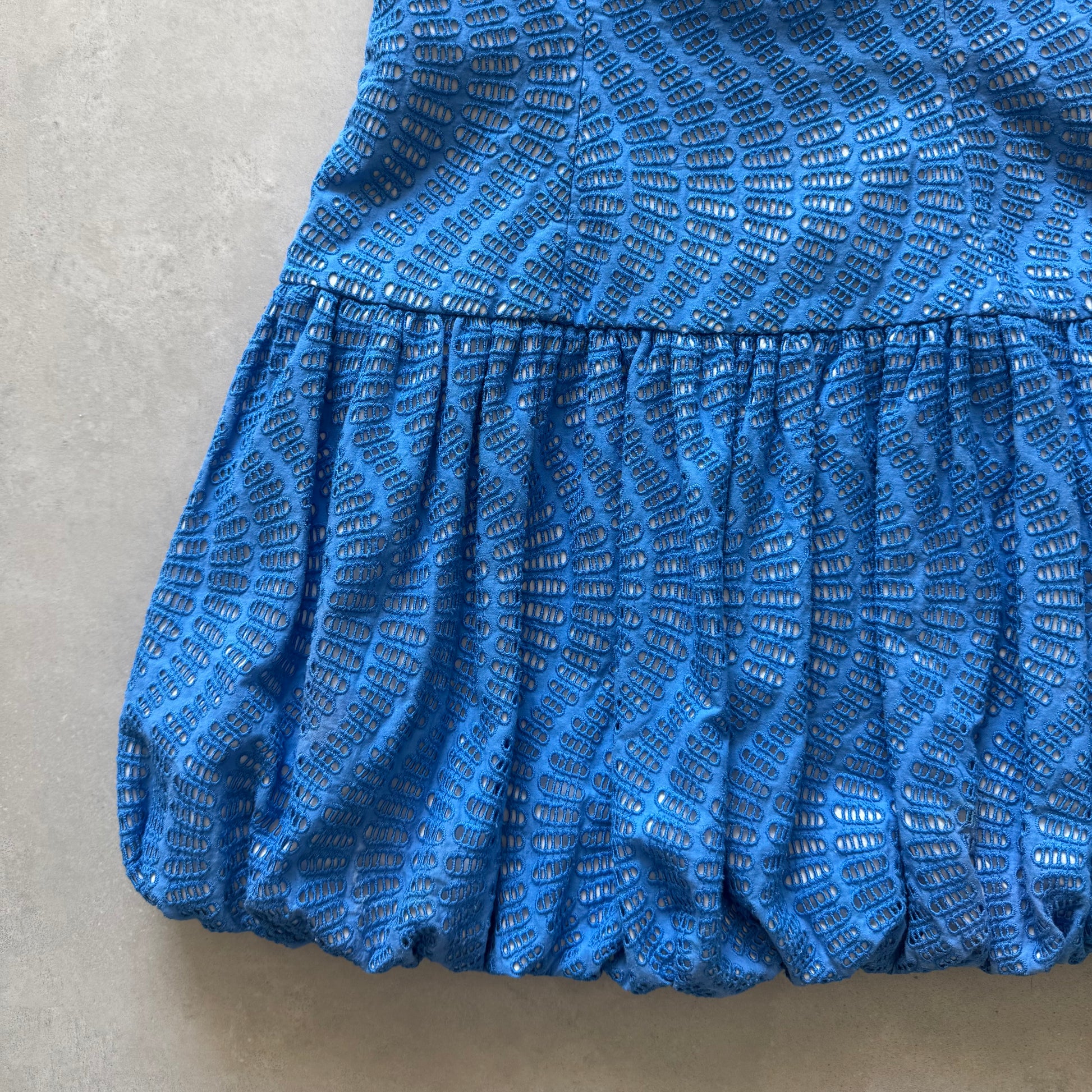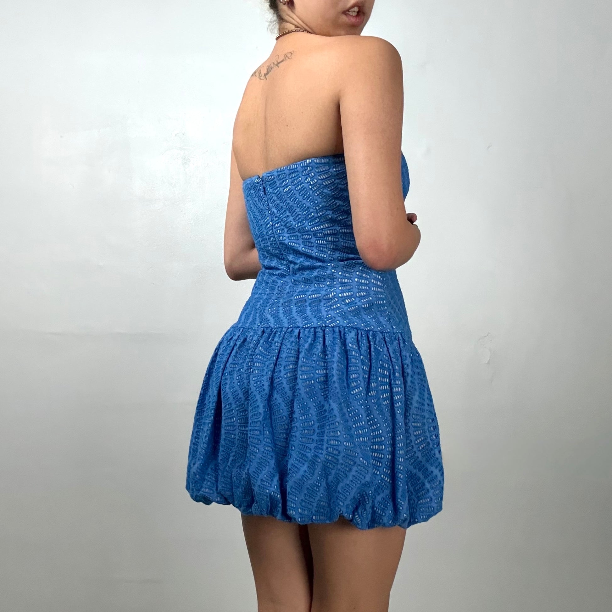 Bright blue strapless mini with textured eyelet pattern. Fitted through the waist with bubble hem skirt. Hidden back zipper closure.
