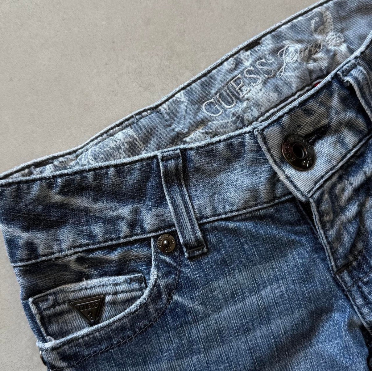 2000s deadstock Guess jeans with studded back pocket and zipper details at the ankle. Low-rise skinny fit.