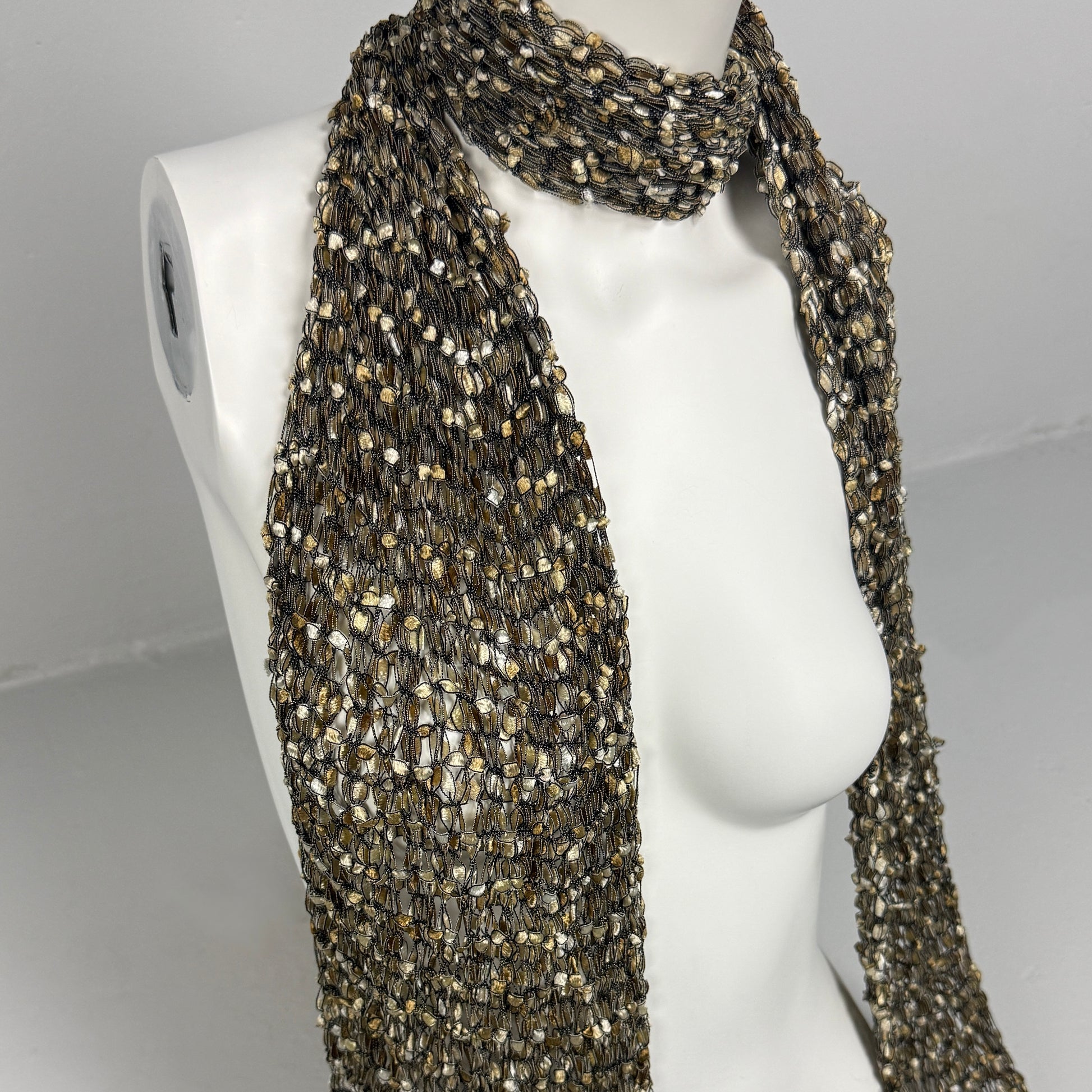 Long metallic knit scarf with mixed gold + bronze shimmer and fringed ends.