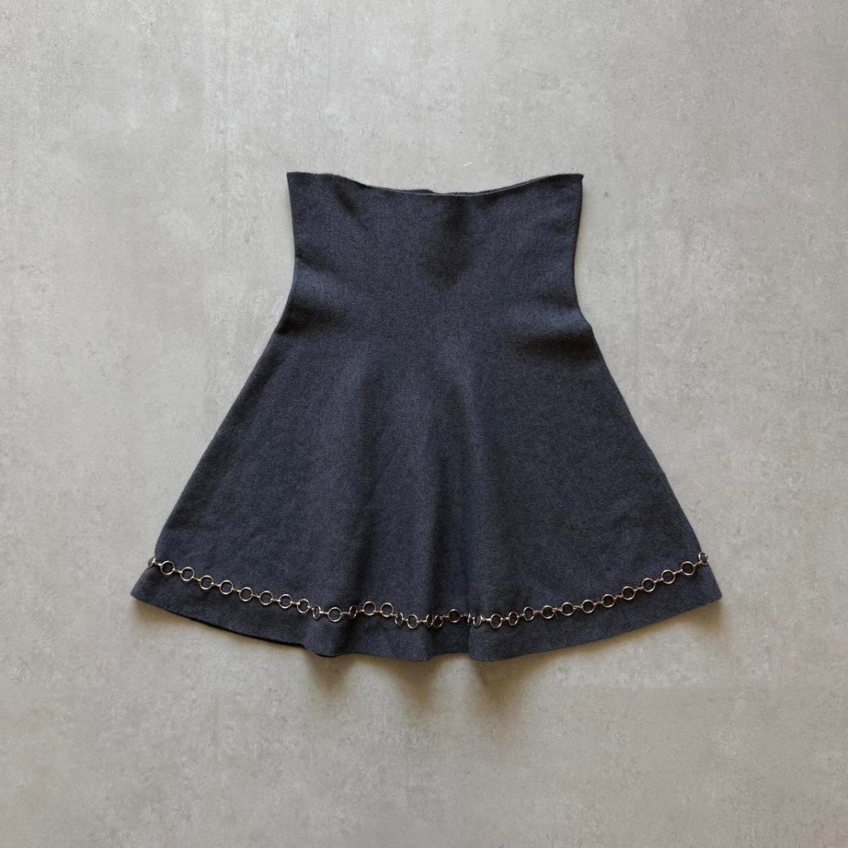 Dark grey knit mini with a flared A-line shape and gold chain detail at the hem. Soft stretch fabric with a pull-on fit.