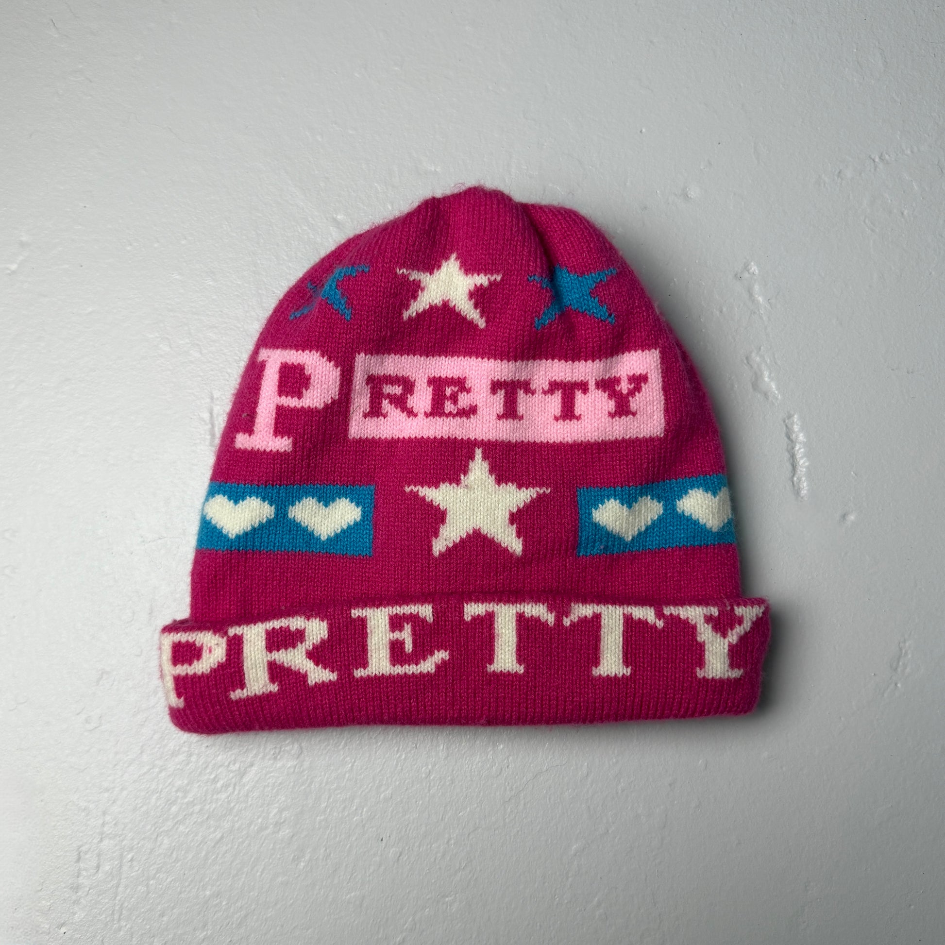 Hot pink knit beanie with stars, hearts, and “PRETTY” graphic all around. Soft stretch knit.