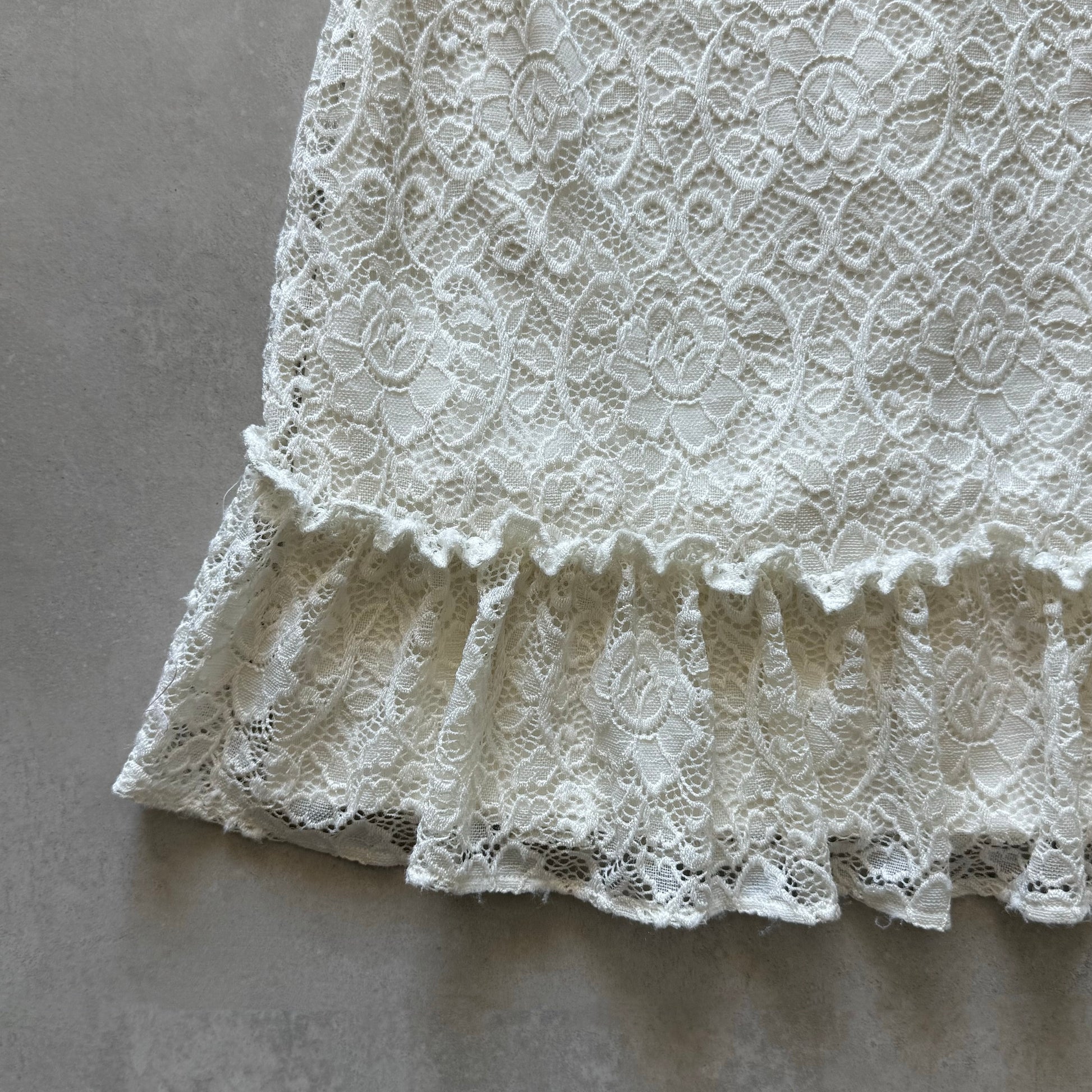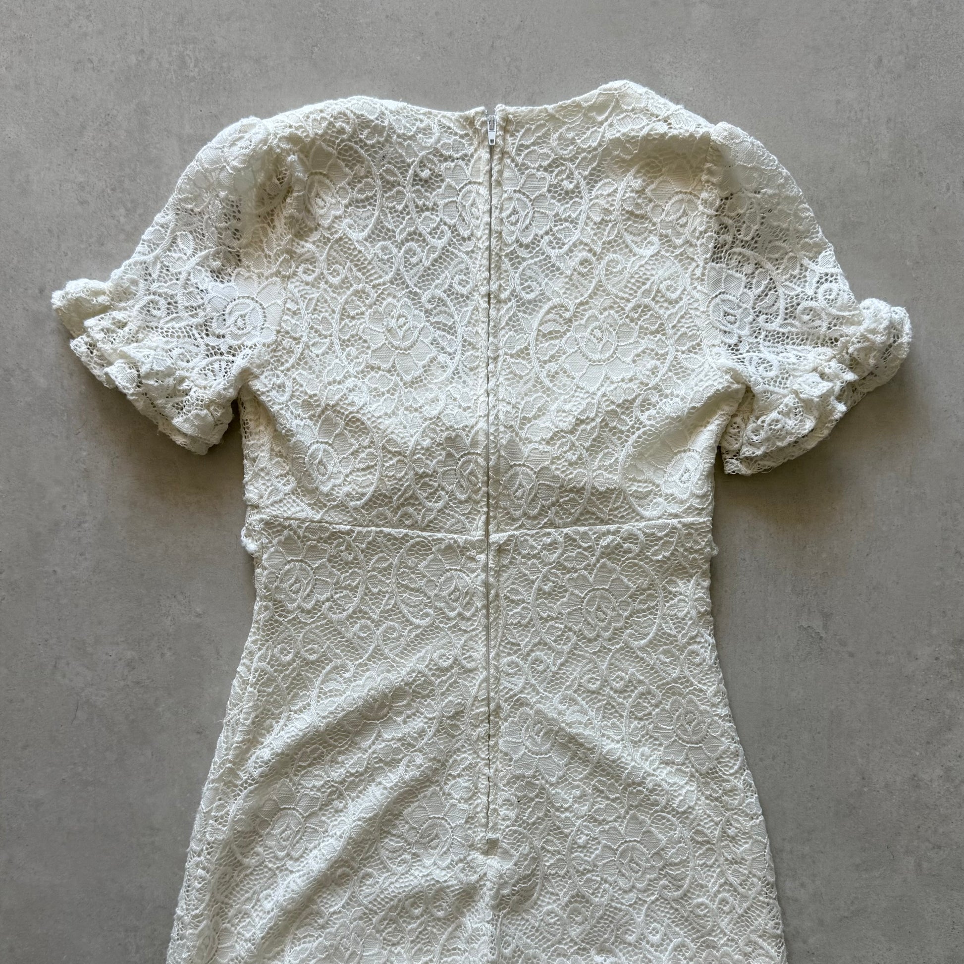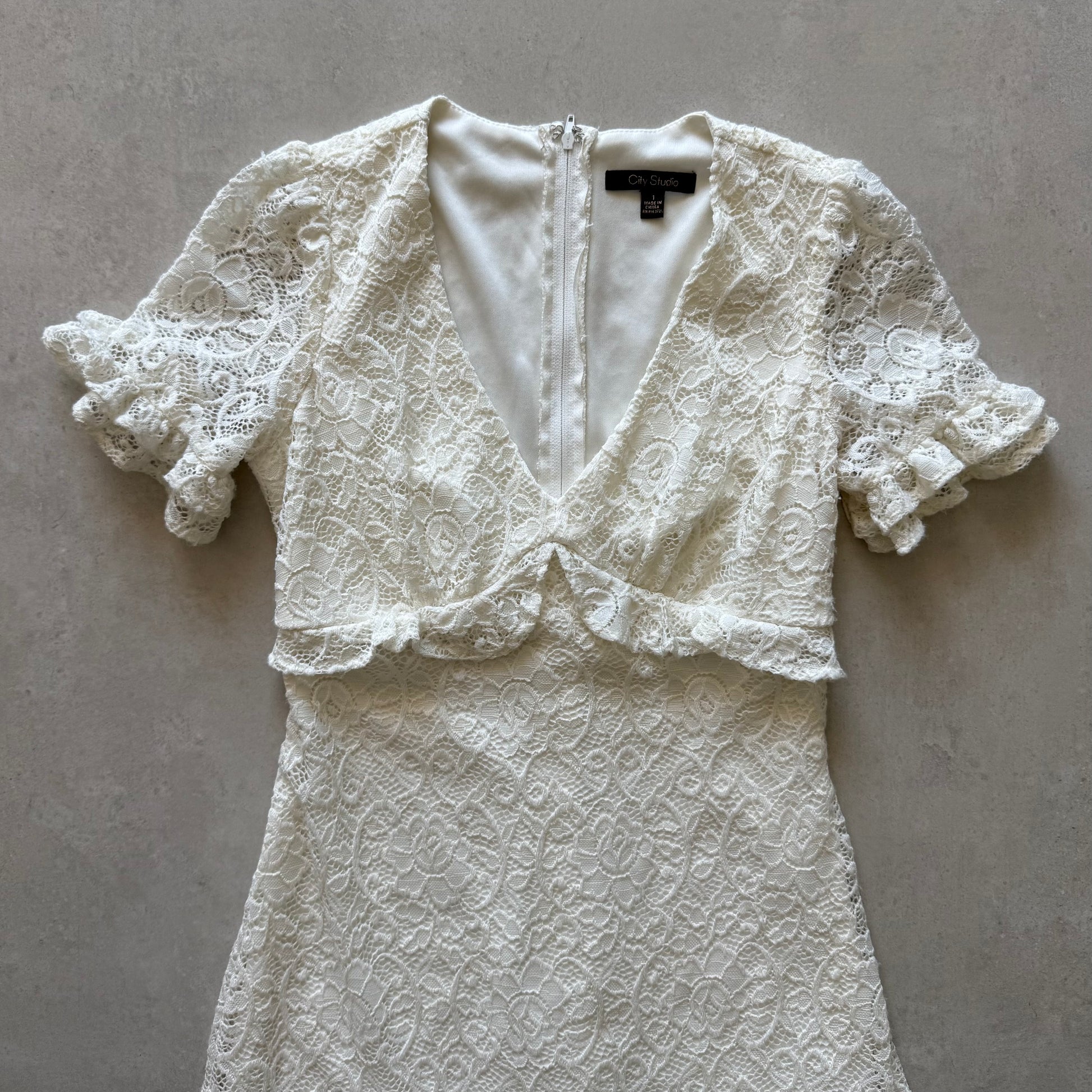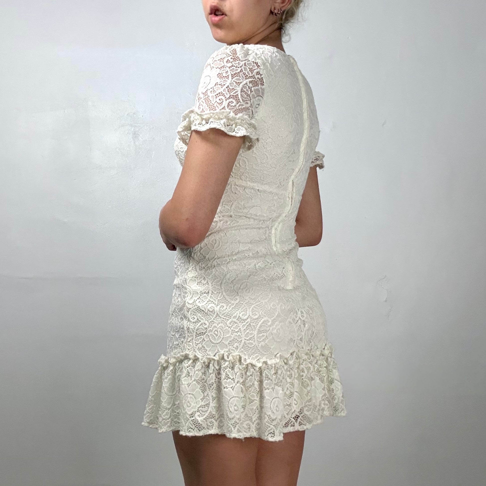 Cream lace bodycon mini dress with V-neckline. Sheer lace short sleeves with ruffle trim & ruffle drop waist. Fully lined through body with back zipper closure.