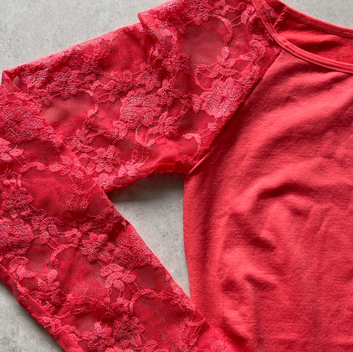 Orange-pink nylon spandex top with lace 3/4 sleeves and ruffle waist. Stretchy & form-fitting.