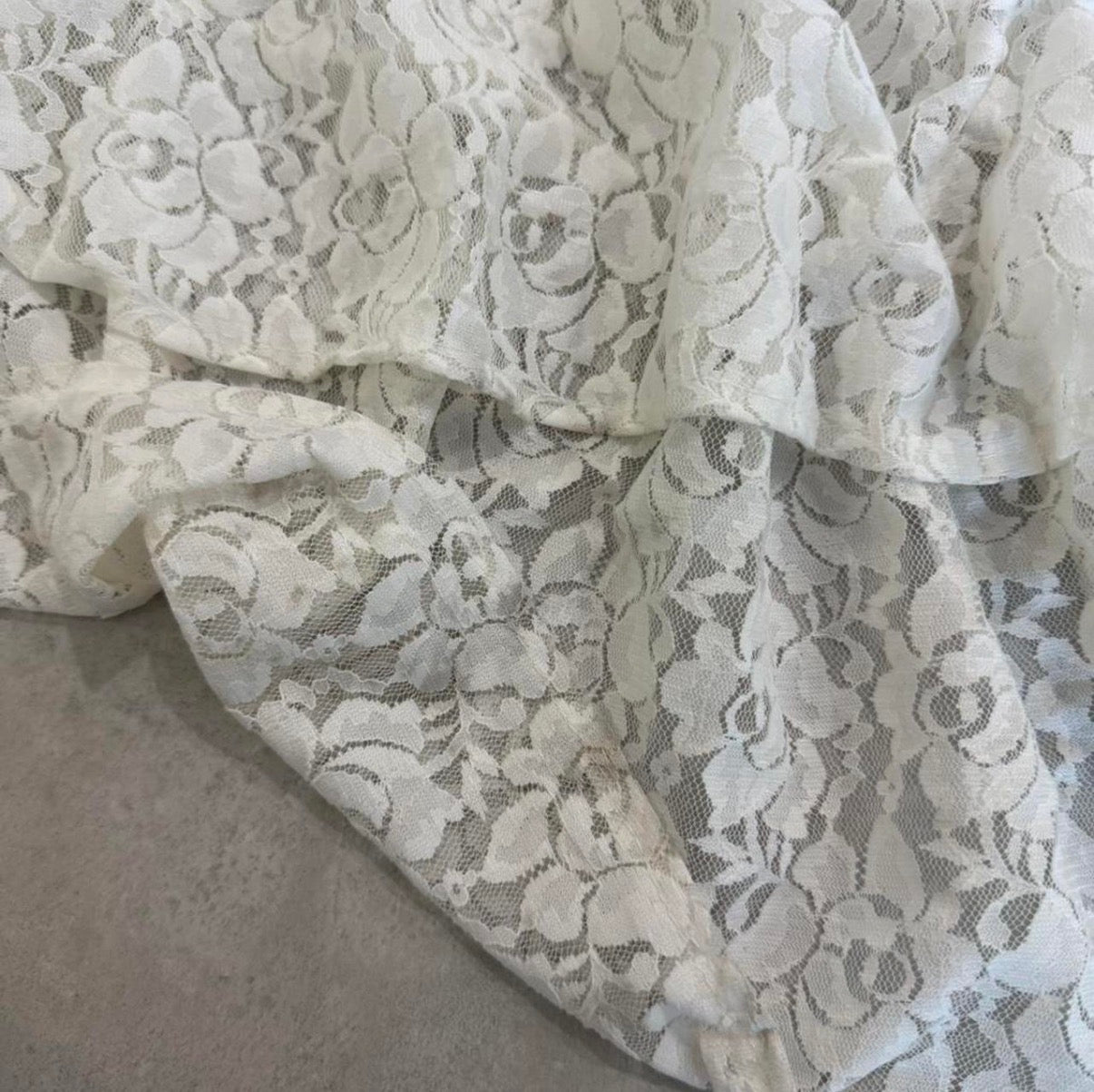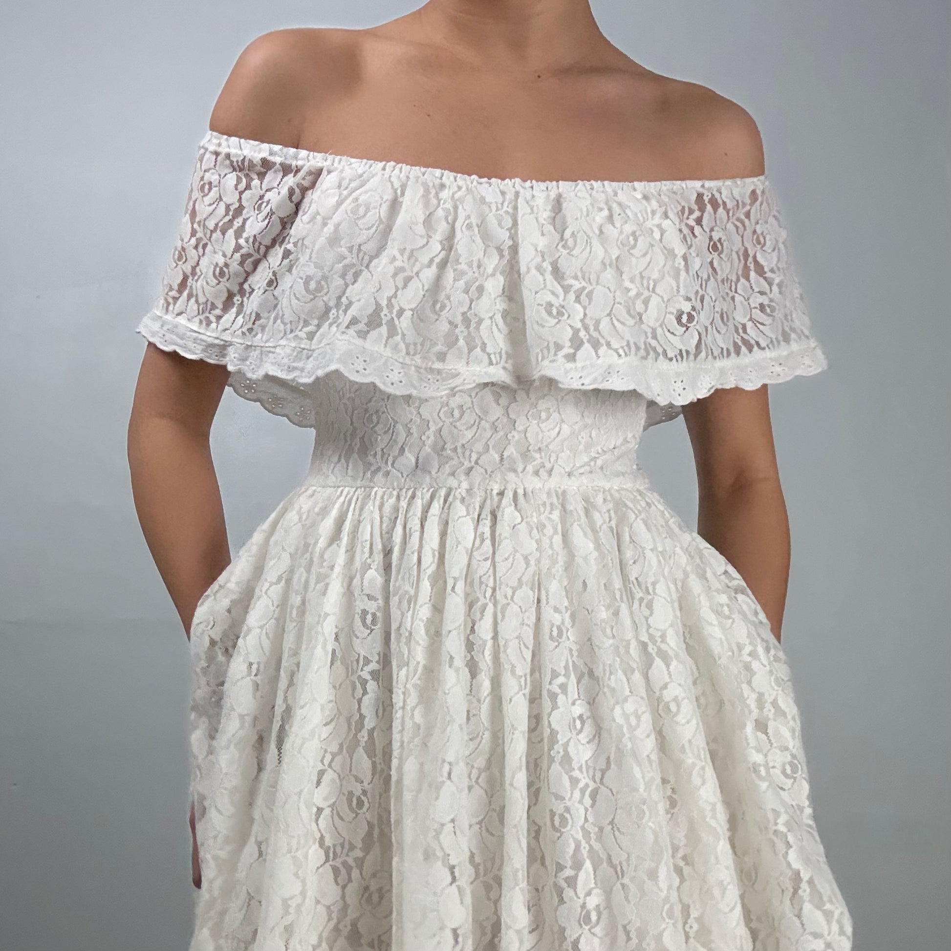 Off-shoulder white lace dress with a ruffled off the shoulder neckline, stretchy bodice, and a tiered high-low skirt. White underlayer attached.