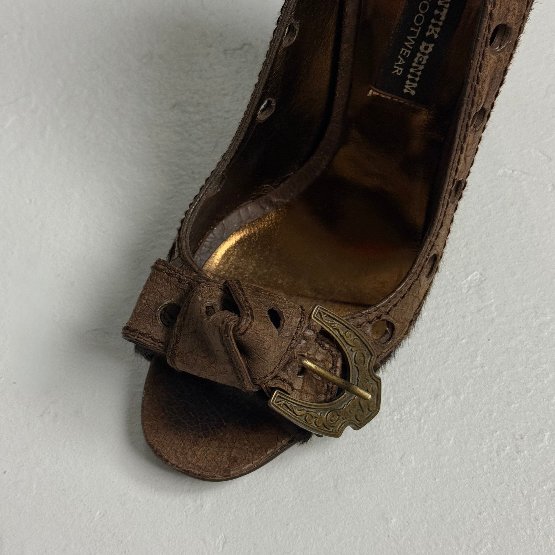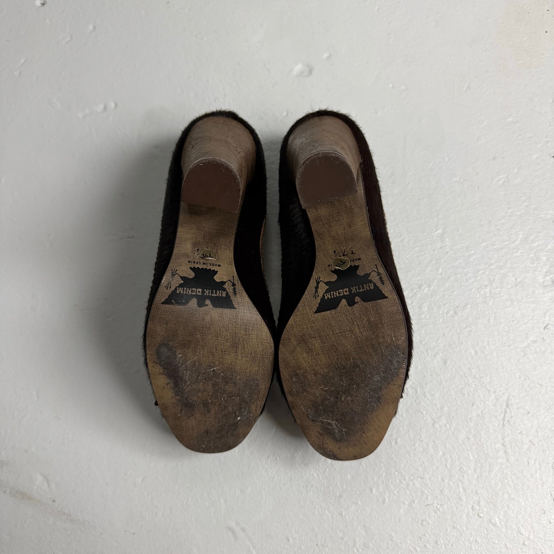 Rare Antik Denim heels with genuine fur sides, open toe, and western-style belt buckle knot detail at the front. Textured brown leather trim, circular cutout details, and a chunky block heel. Made in Spain