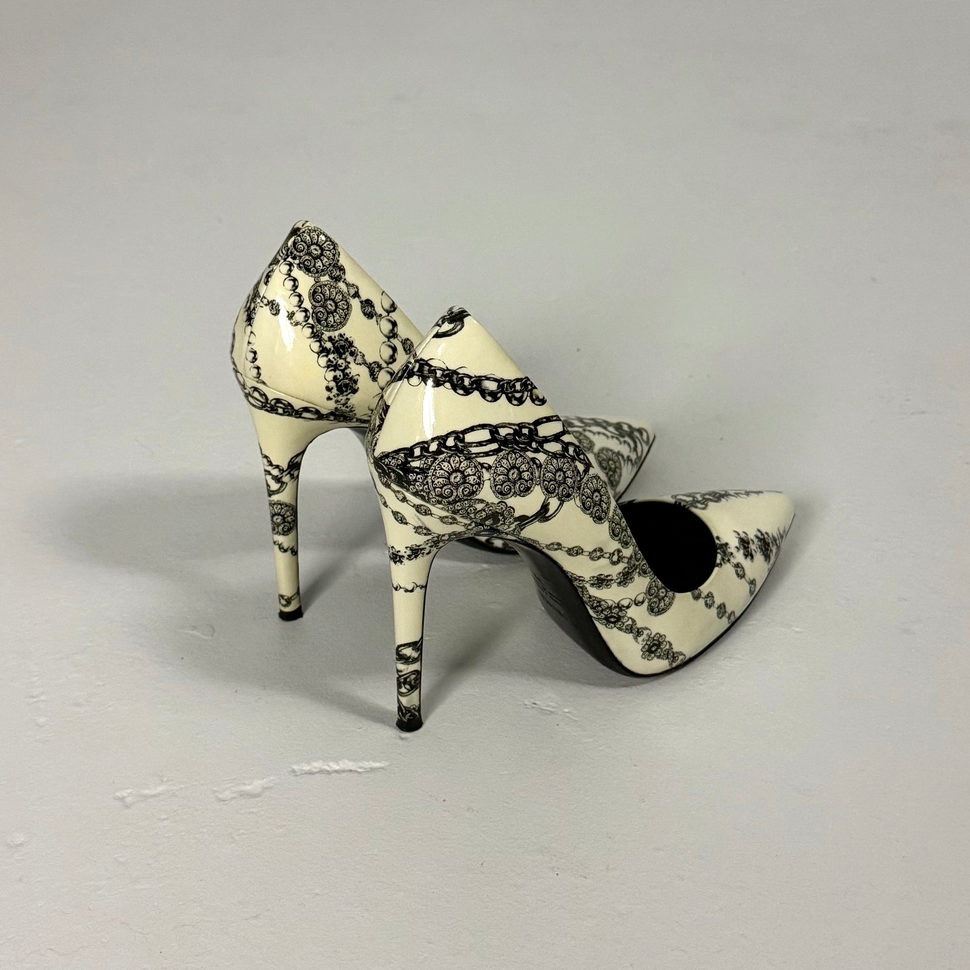 White patent leather pumps with black heart chains and medallion print. Stiletto heel, and black leather insoles. Made in italy