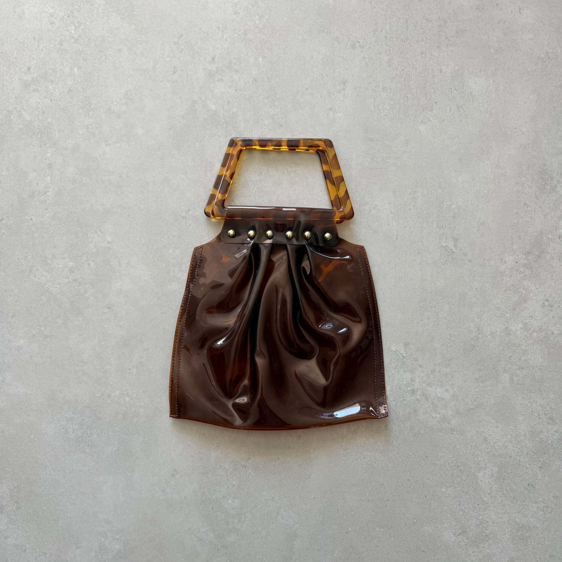 90s structured square bag with chunky tortoiseshell plastic handles, silver stud hardware, and gathered vinyl body.