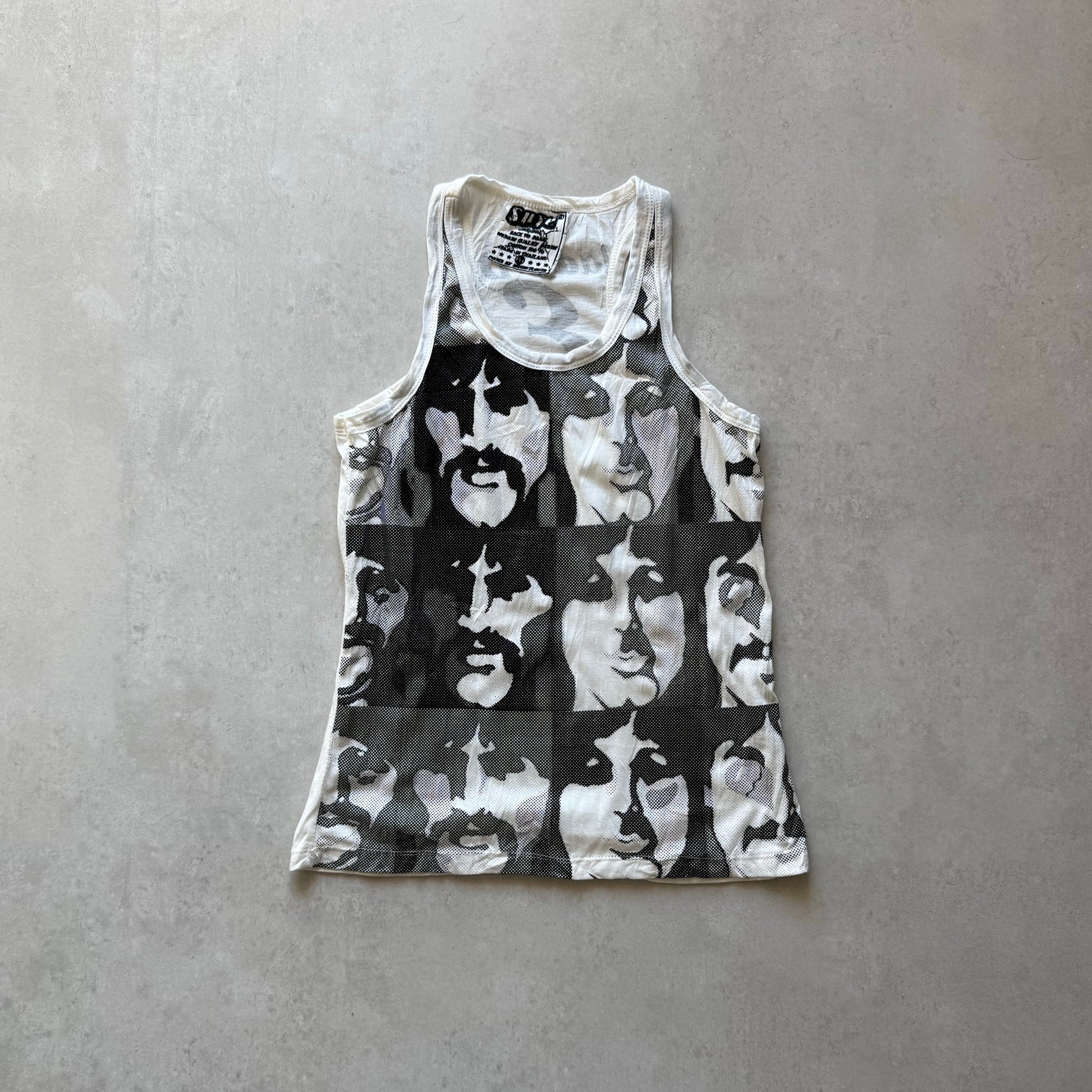 2000s Racerback cotton tank with a grayscale face collage graphic print resembling Lennon, Ringo & Paul. “Lady D 3” print on the back.