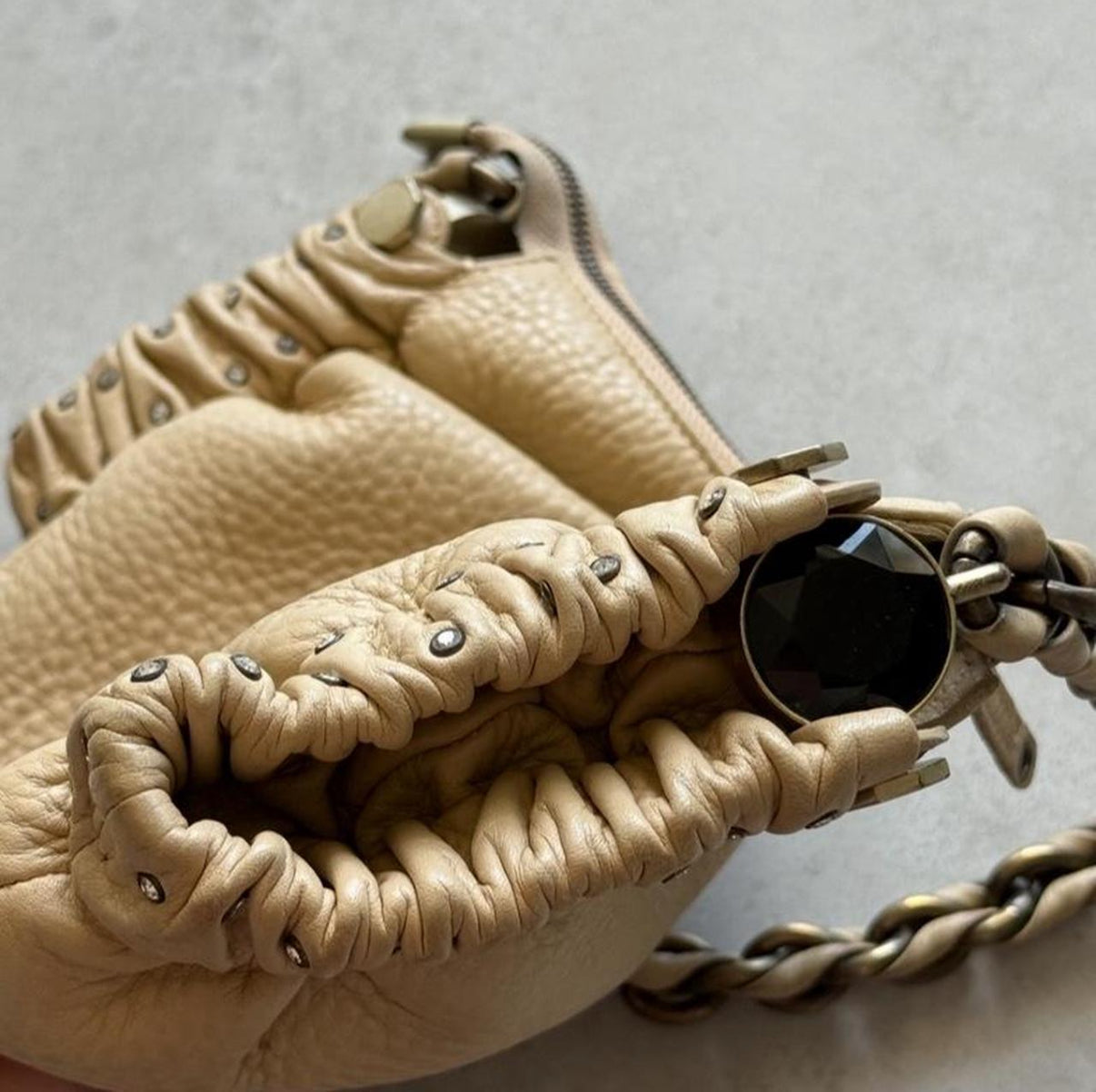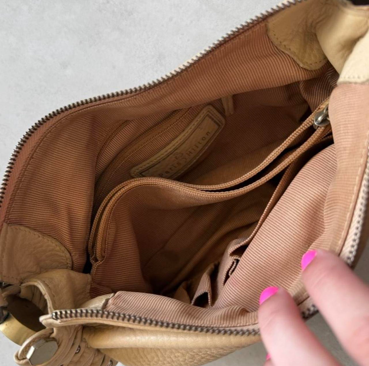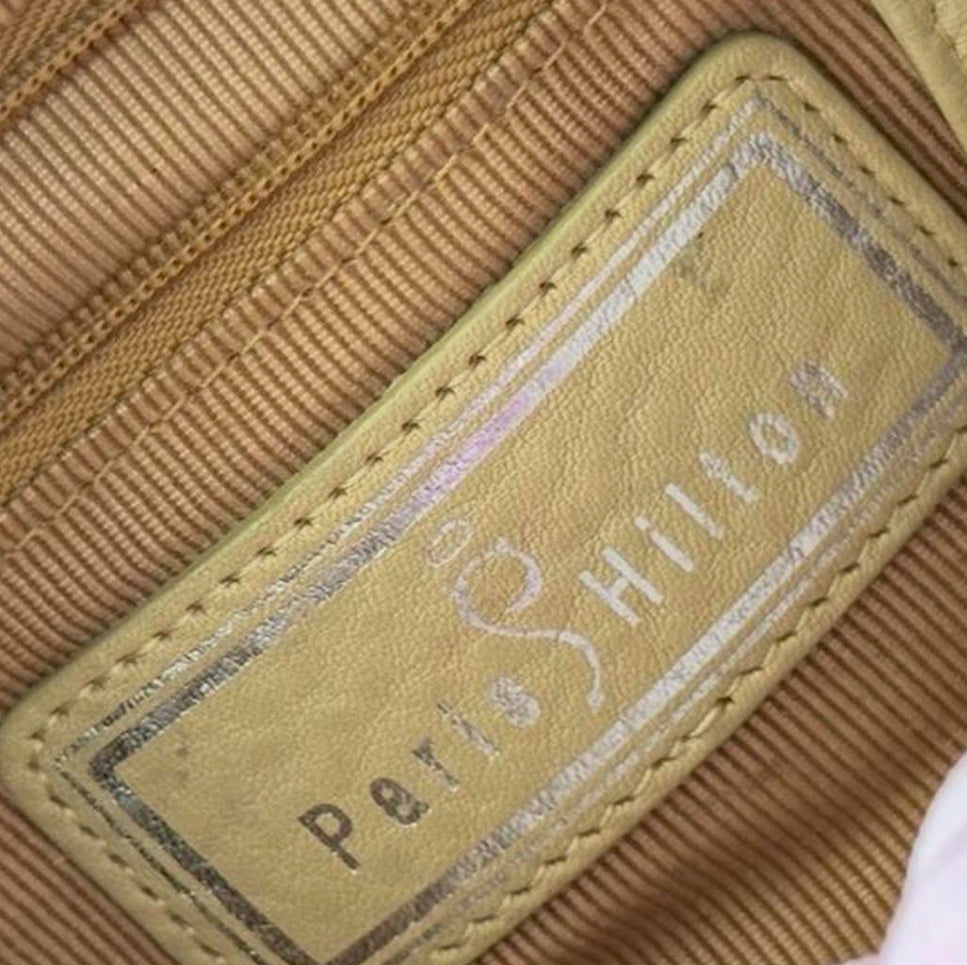 Cream pebbled faux leather bag with gathered sides, silver rivet details, and “Paris Hilton” embossed on the front. Black jewel accent on sides. Spacious interior with lipstick pockets and 2 zip compartments.