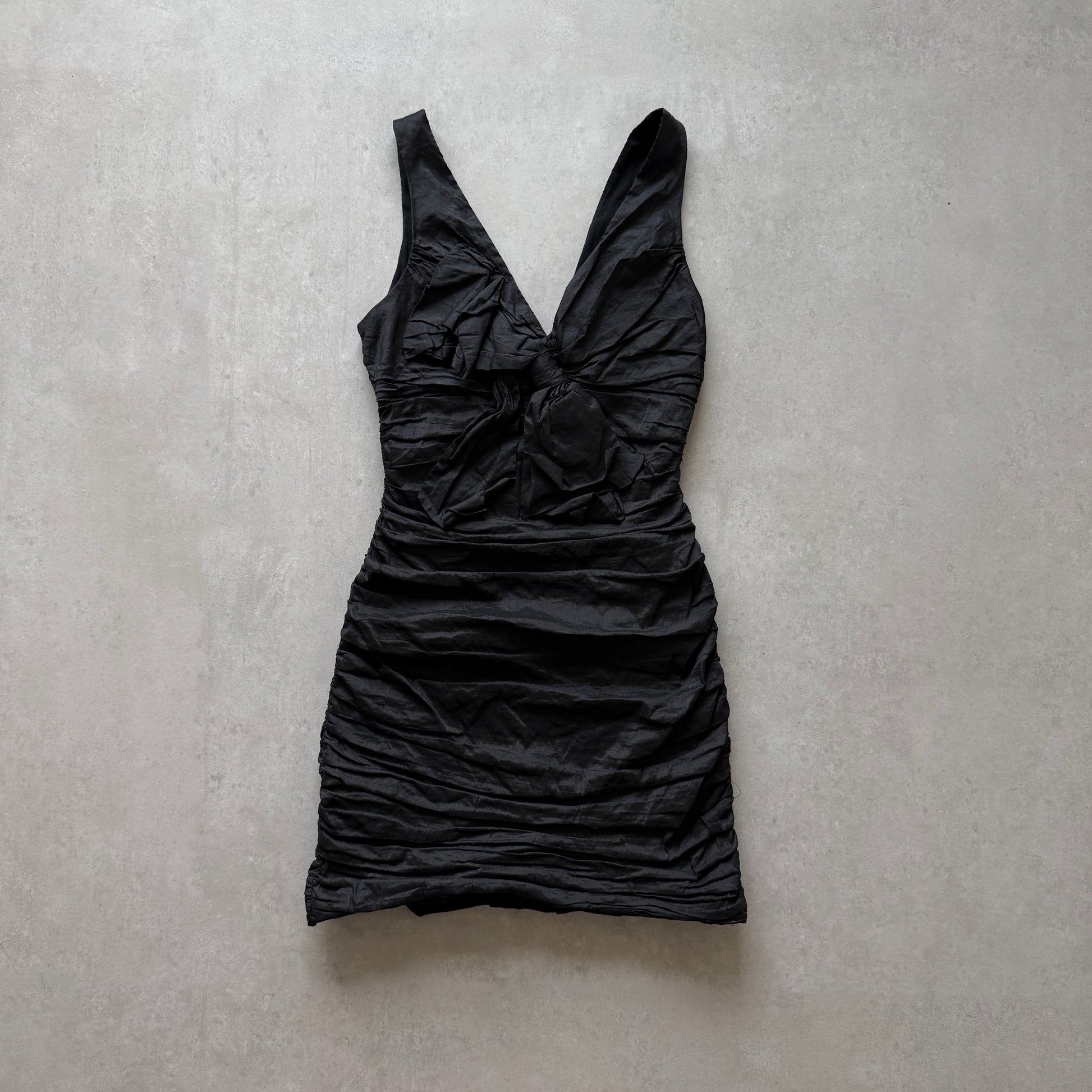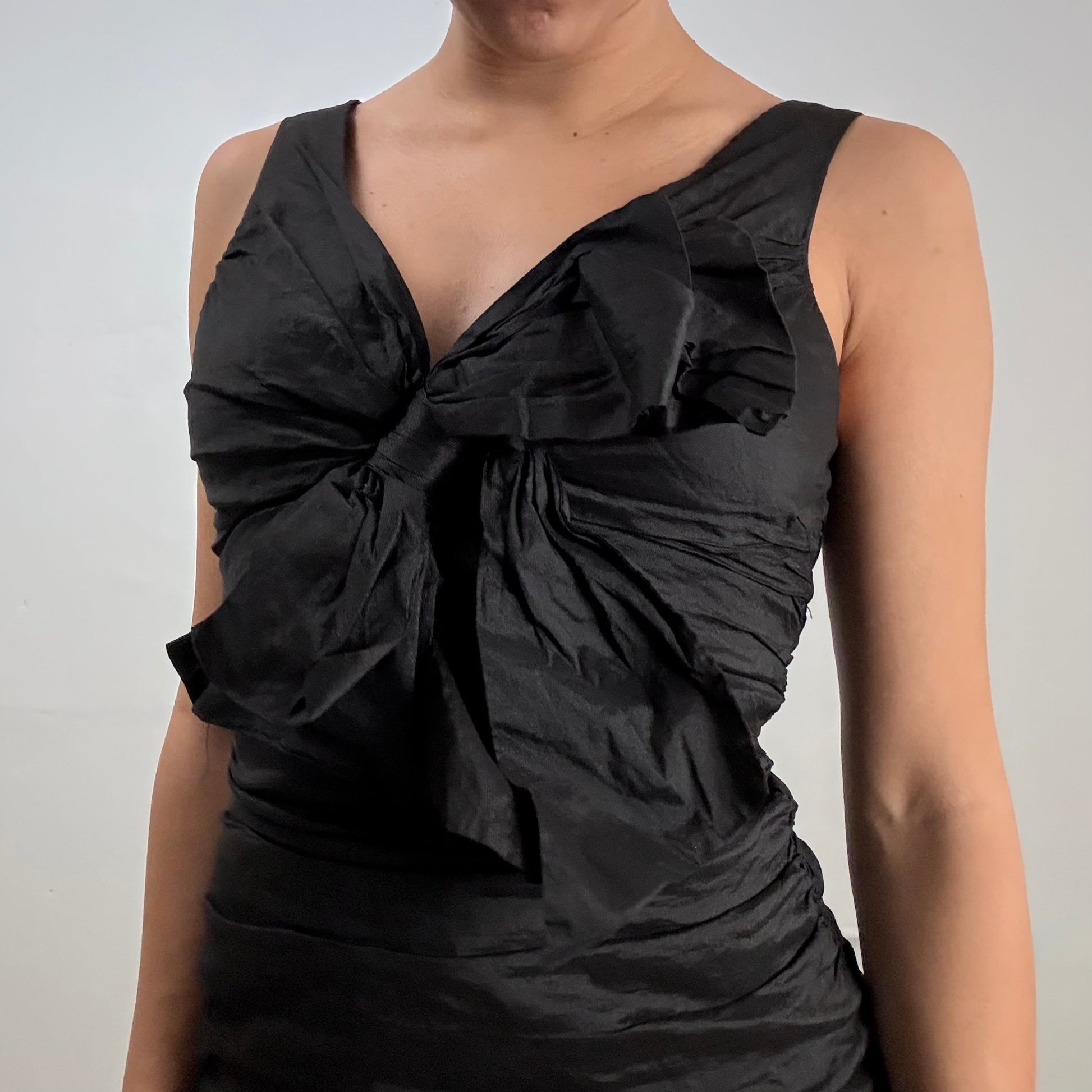 Ruched mini dress with deep V neckline and oversized bow in front . Black taffeta-style fabric with side ruching, fitted silhouette.