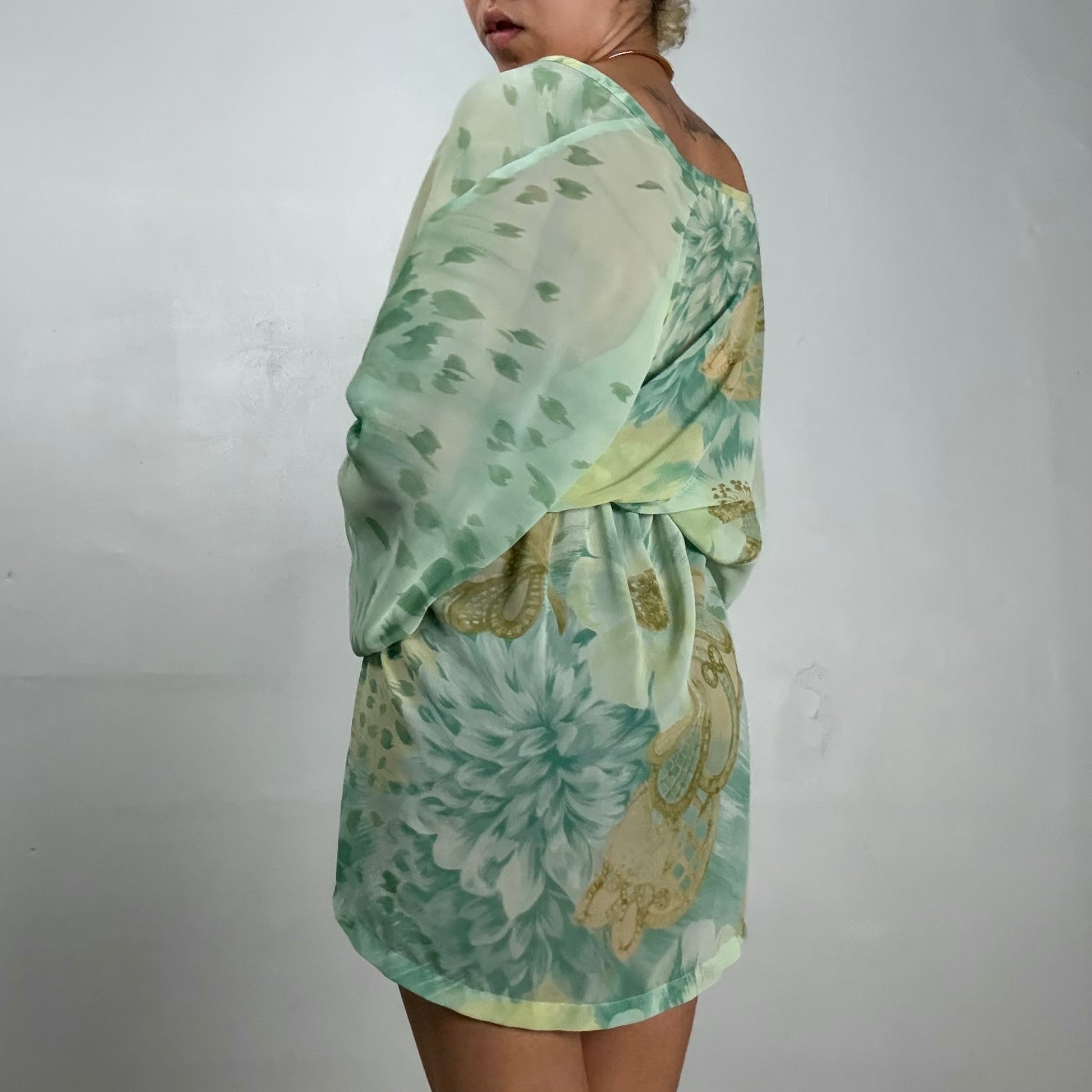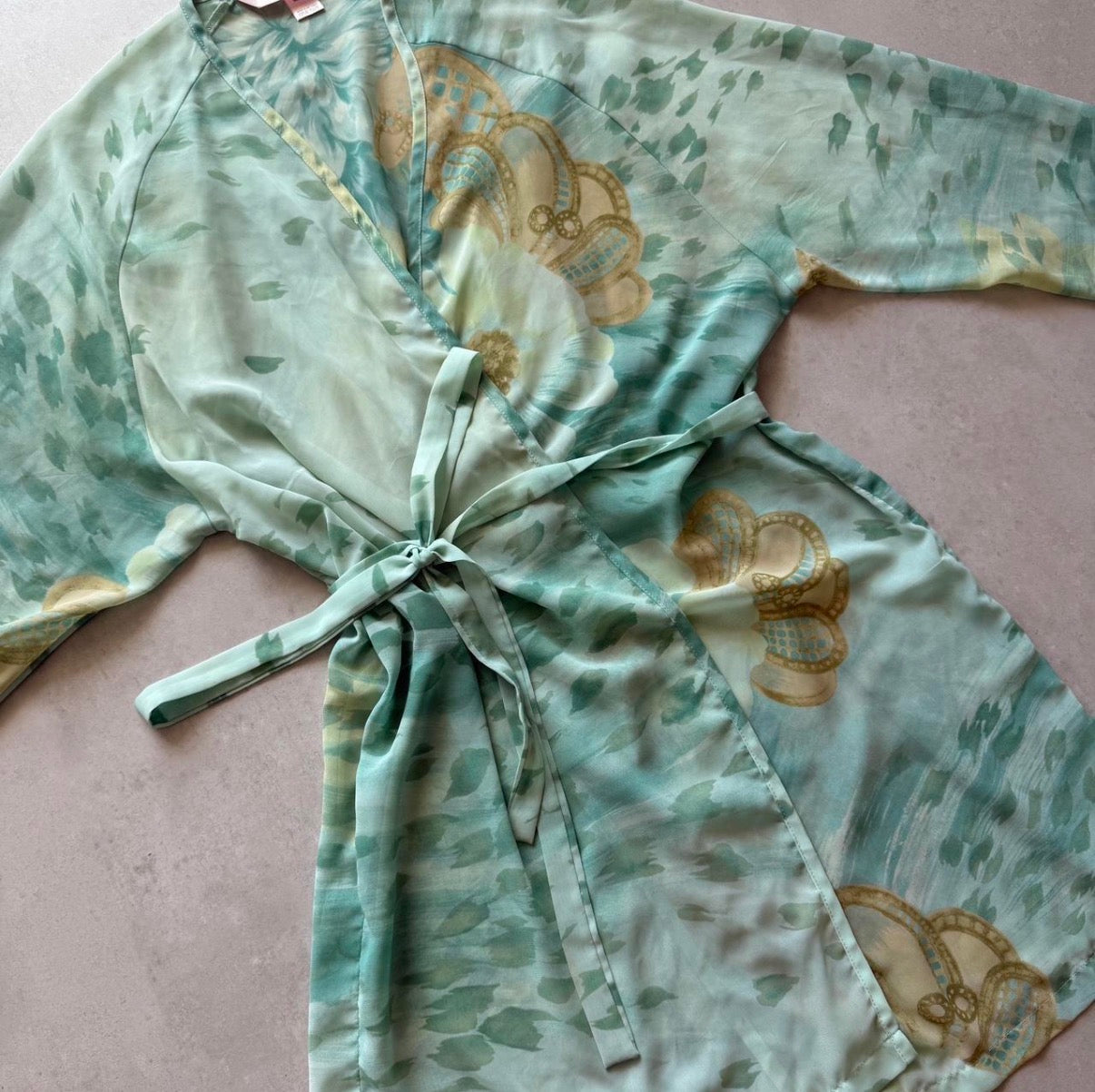 Aqua green sheer cover up with floral print and gold accents. Wrap style with tie belt and long sleeves.