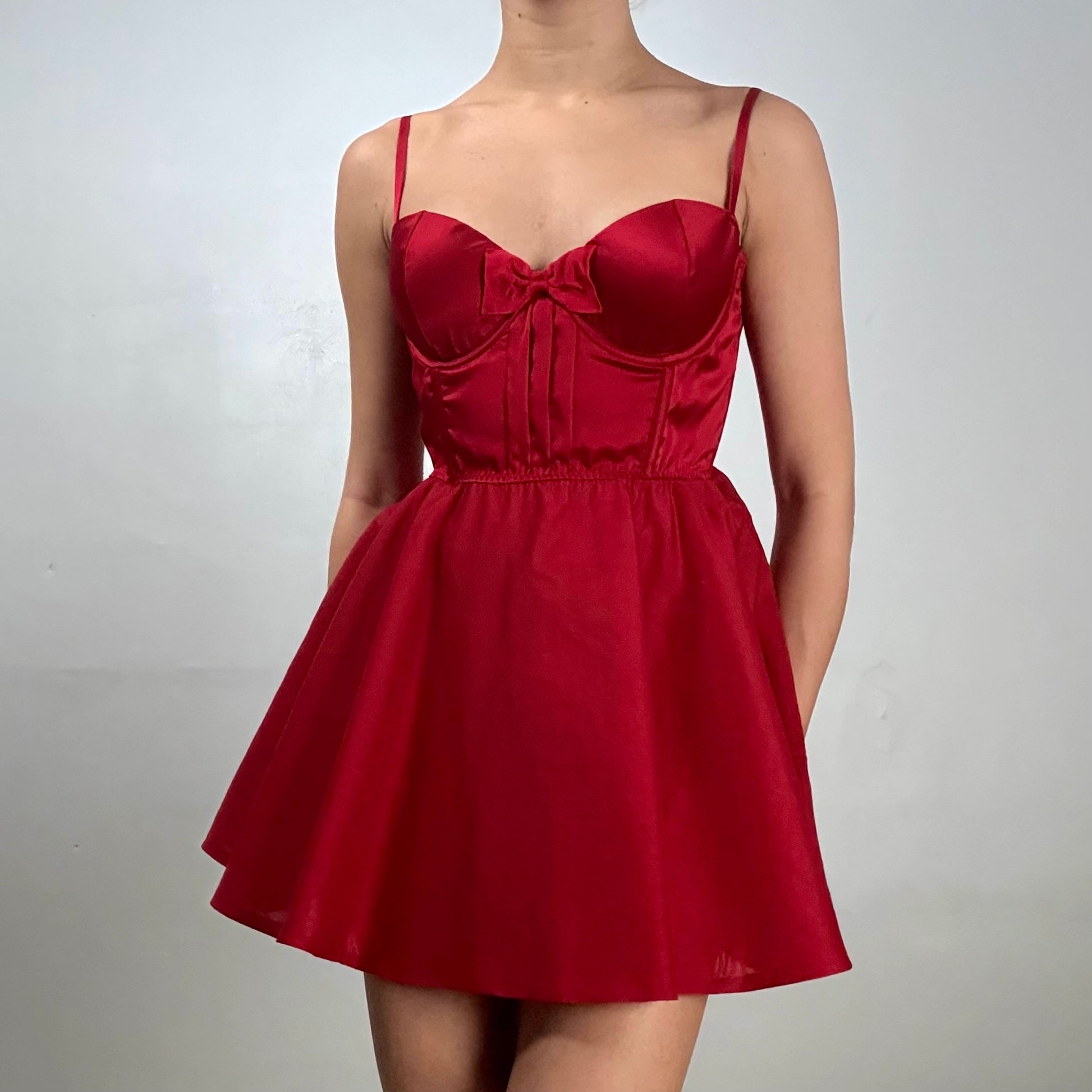 2000s Vintage mini corset style mini with back zipper, bow detail, and adjustable straps. Flowy skirt with a lightweight fabric.
