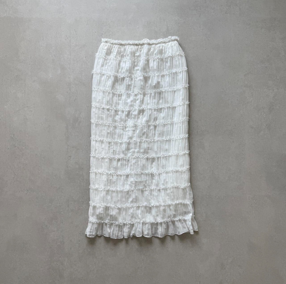 White floor-length skirt with crinkle pleats, lace layers, and a sheer ruffled hem. Elastic waistband with drawstring. Fully lined